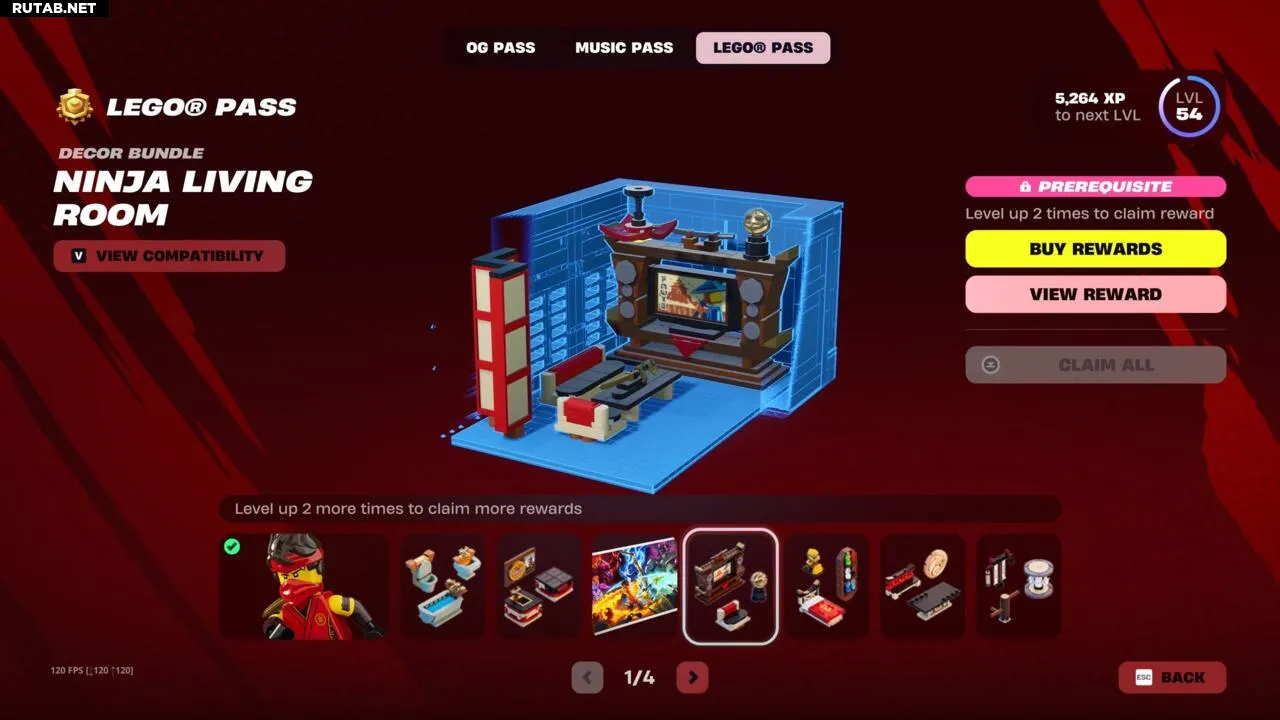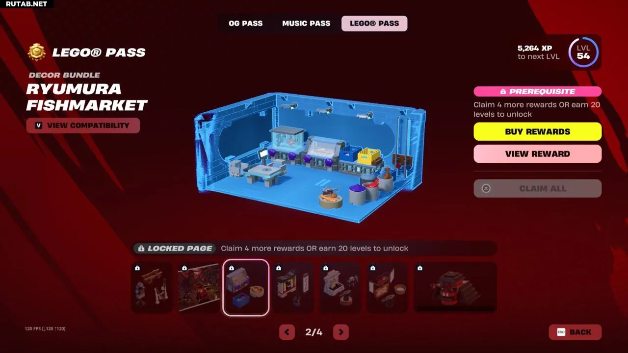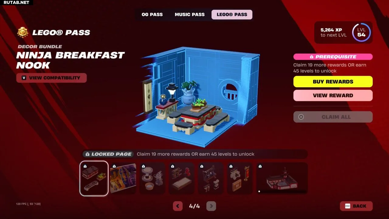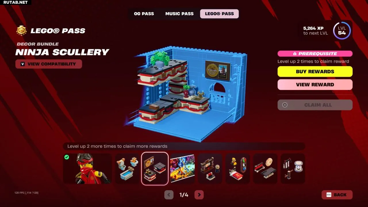 Скин Повелителя огня Кая разблокируется мгновенно при покупке Ninjago Lego Pass за 1400 V-баксов. Он также доступен через подписку Fortnite Crew. Дальнейшие награды, включая различные тематические постройки, предметы декора, новую эмоцию и загрузочные экраны, открываются за уровни аккаунта: по одному предмету за каждые два заработанных уровня. Для получения всего контента из пасса потребуется достичь 60-го уровня.