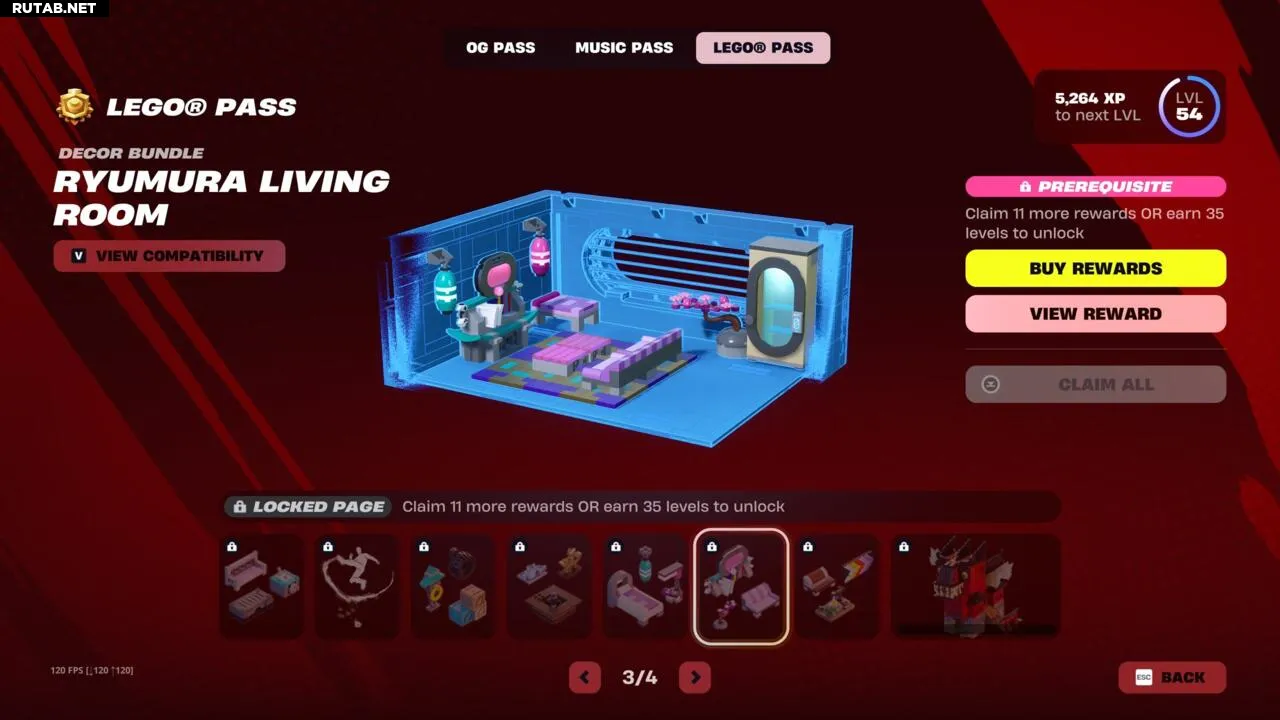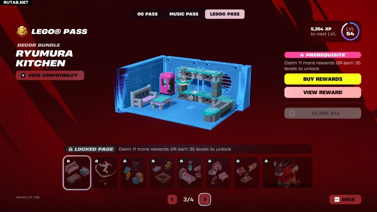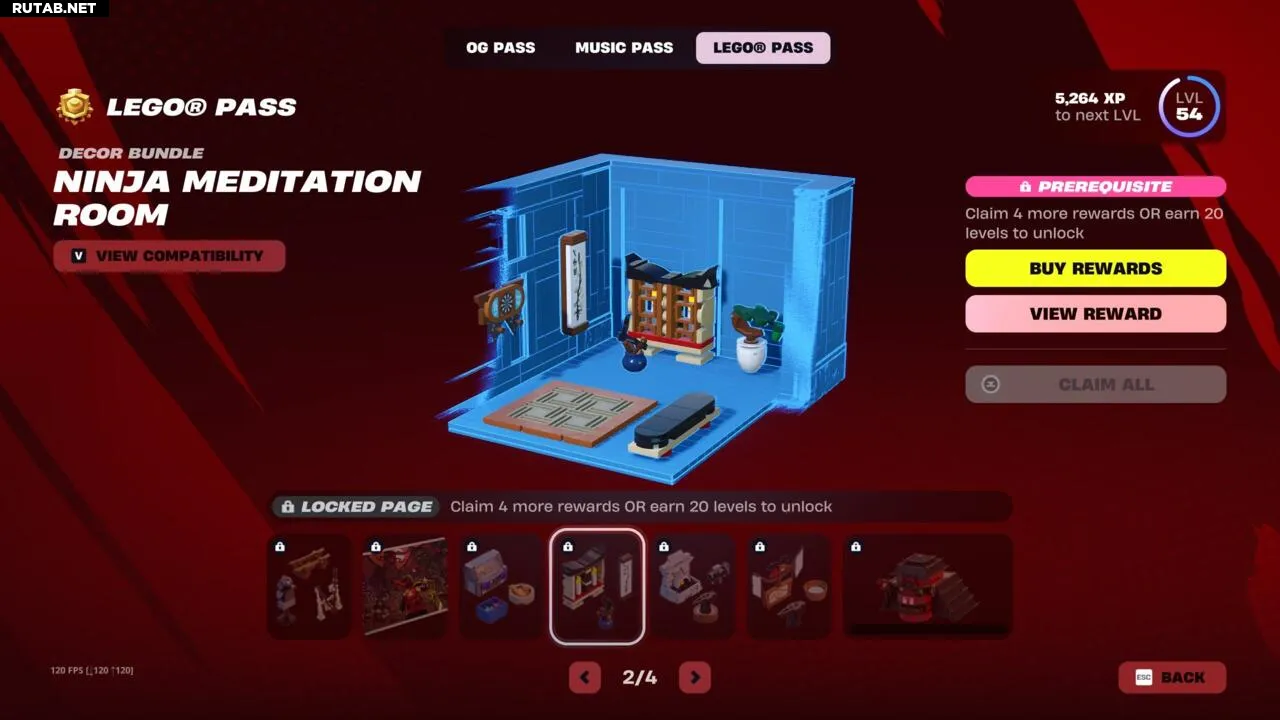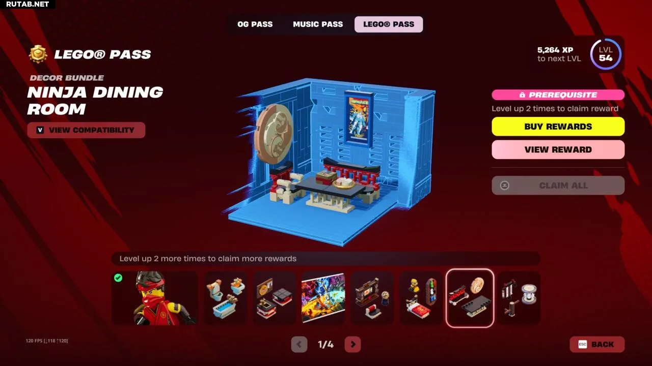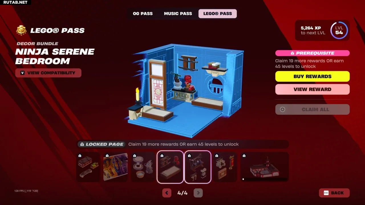 Скин Повелителя огня Кая разблокируется мгновенно при покупке Ninjago Lego Pass за 1400 V-баксов. Он также доступен через подписку Fortnite Crew. Дальнейшие награды, включая различные тематические постройки, предметы декора, новую эмоцию и загрузочные экраны, открываются за уровни аккаунта: по одному предмету за каждые два заработанных уровня. Для получения всего контента из пасса потребуется достичь 60-го уровня.