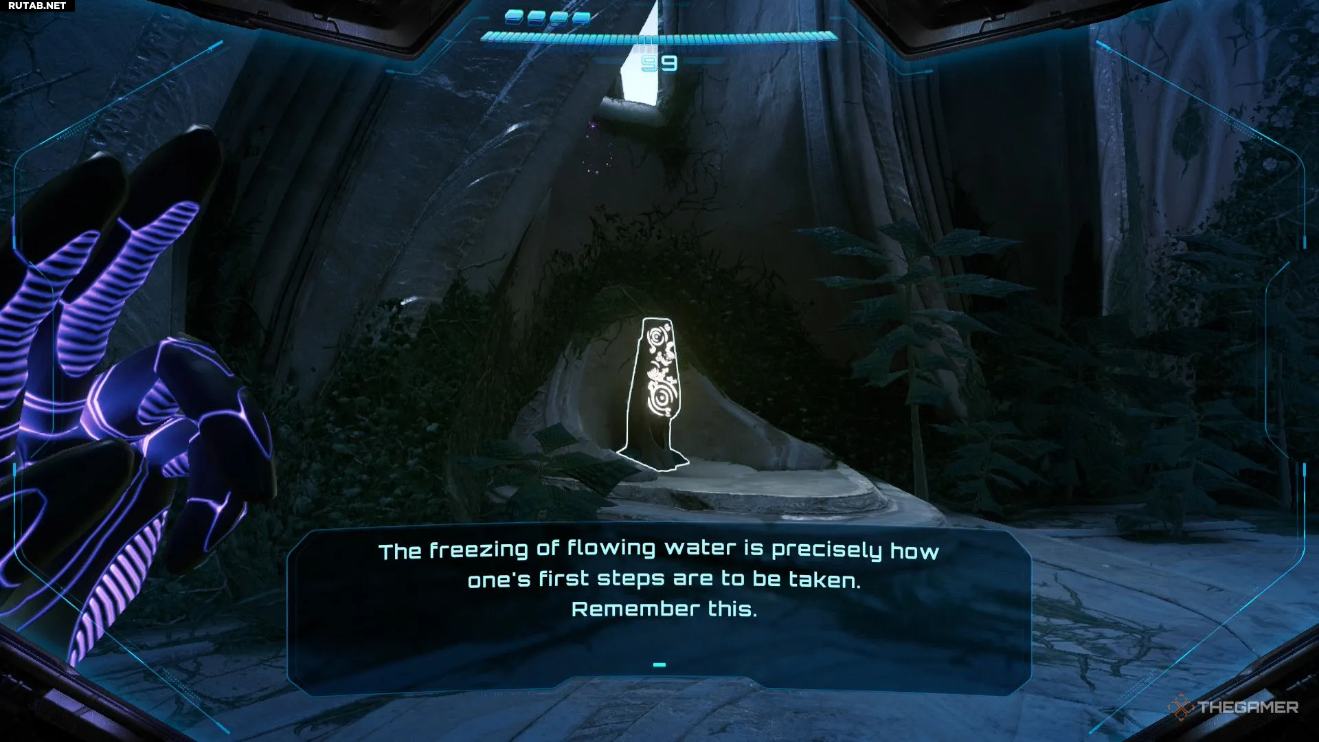 Здесь вас ждут фонтаны воды и расширение для бластера на вершине центрального пьедестала. Как сообщают таблички в комнате, нужно заморозить воду, чтобы подняться наверх. Вода остается замороженной недолго, поэтому быстро стреляйте ледяными зарядами по фонтанам по порядку и поднимайтесь к награде.