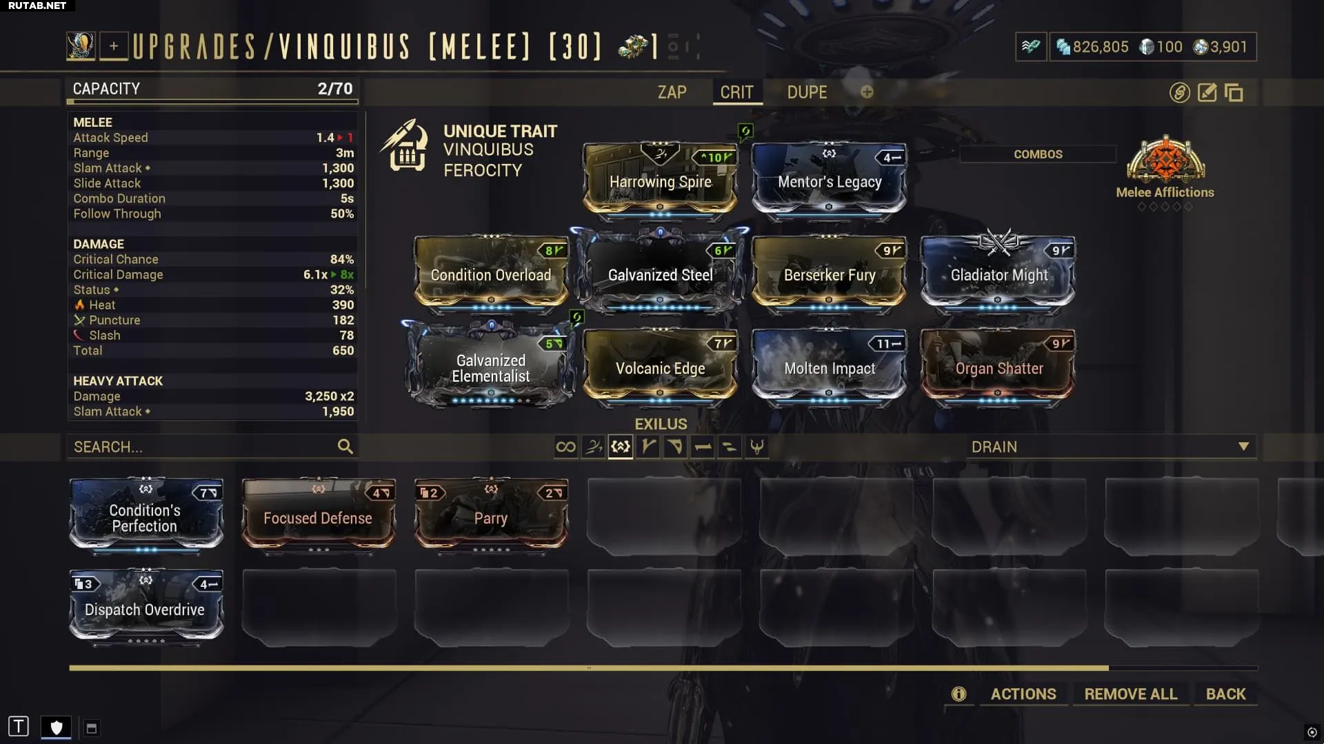 Высокий базовый шанс крита в 40% делает Vinquibus отличным оружием для сборок, ориентированных на критический урон, подобных описанным выше. Оно лучше всего проявит себя на варфреймах, сфокусированных на ближнем бое, таких как Куллерво и Валькирия, но будет неплохо работать и с другими, включая Урииля. Для этой сборки есть два варианта арканы: