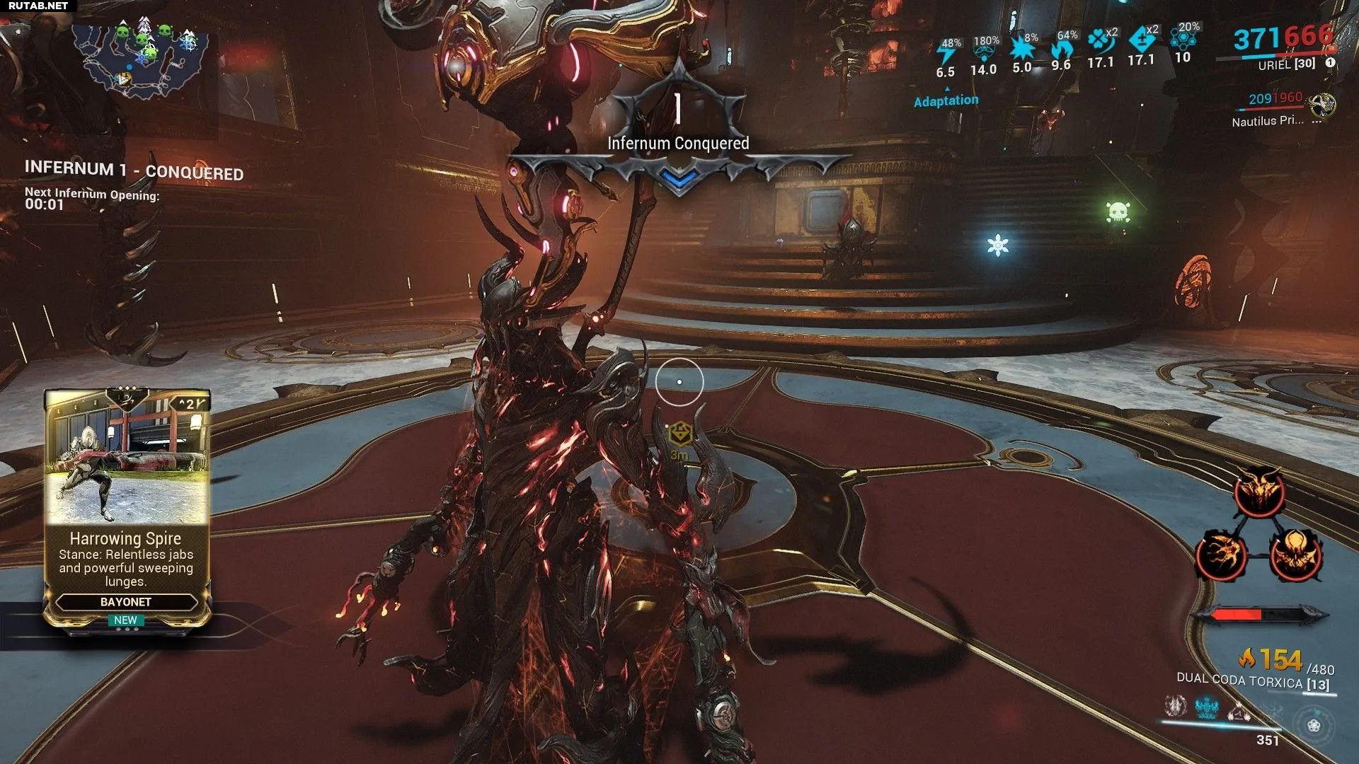 Так же, как и сам Vinquibus, модификатор стойки Harrowing Spire для этого типа оружия ближнего боя может выпасть во время прохождения «Низвержения». Завершение Инфернума или разрушение контейнеров в этих миссиях даёт шанс получить копию Harrowing Spire (или компоненты для Урииля).