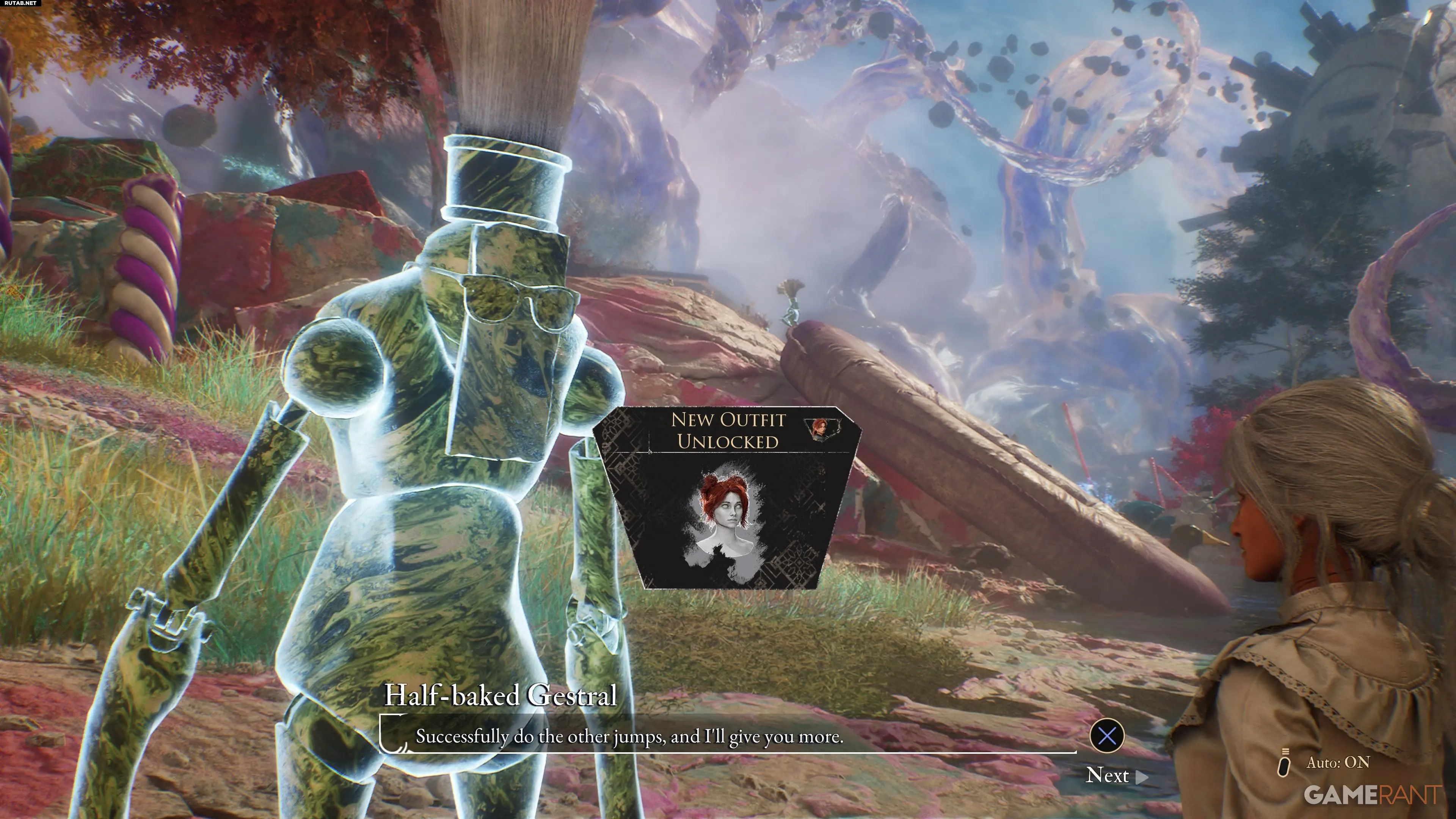 Теперь нужно по очереди прыгнуть в каждый обруч. С жёлтым, самым большим, проблем не возникнет. После этого поговорите с полуиспечённым жестралем поблизости, чтобы получить награду «Цвет люмины».