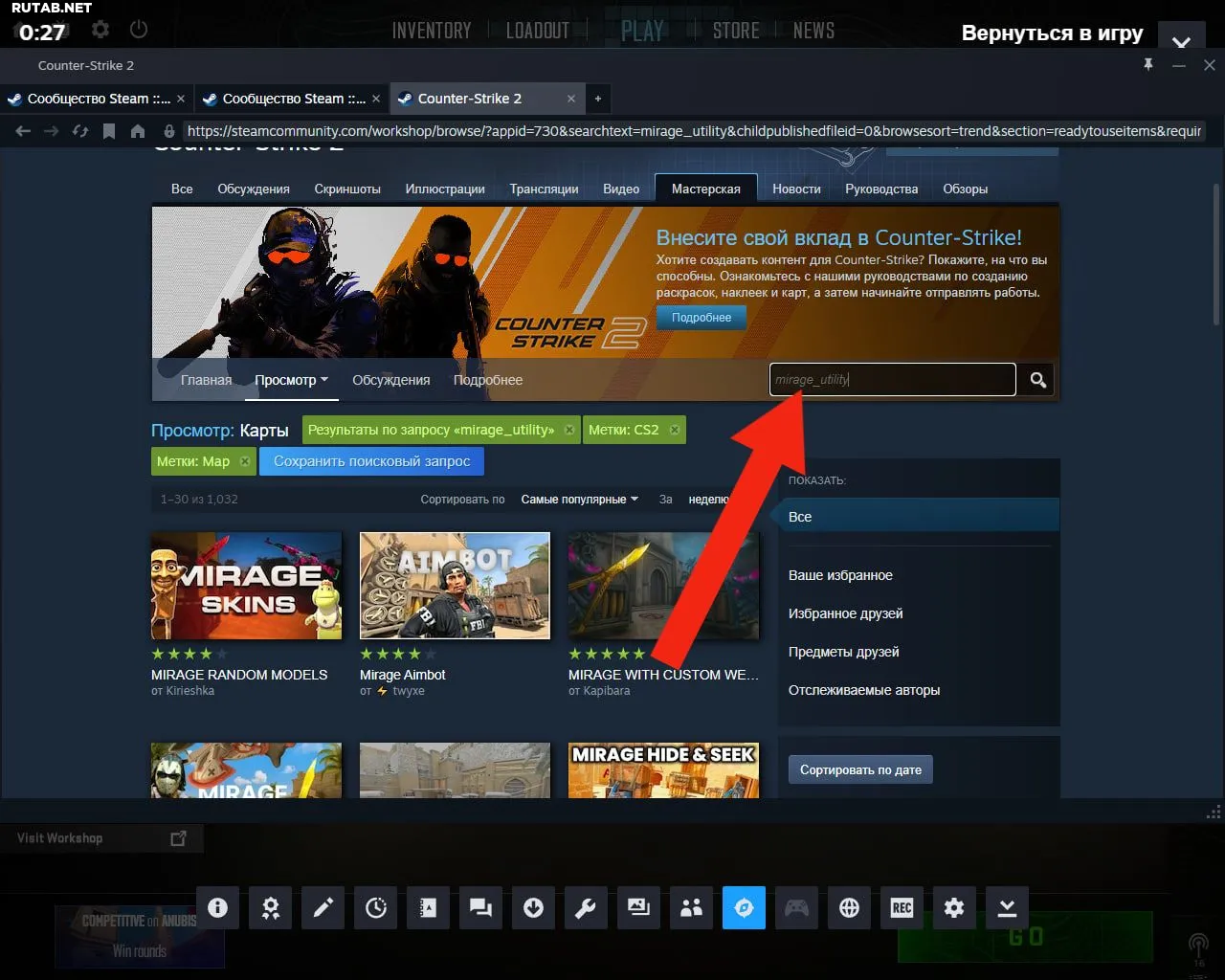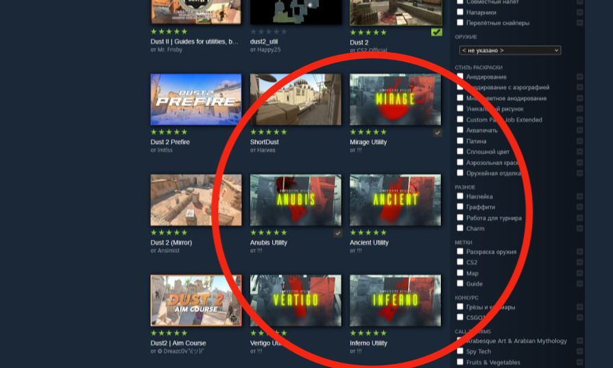 В поиске мастерской Steam ищите карты с пометкой «utility» (утилиты). Обычно они называются по шаблону «Название_карты_utility», например, Mirage_utility, Anubis_utility, Inferno_utility и так далее. Найдите карту для нужной вам локации и подпишитесь на неё.