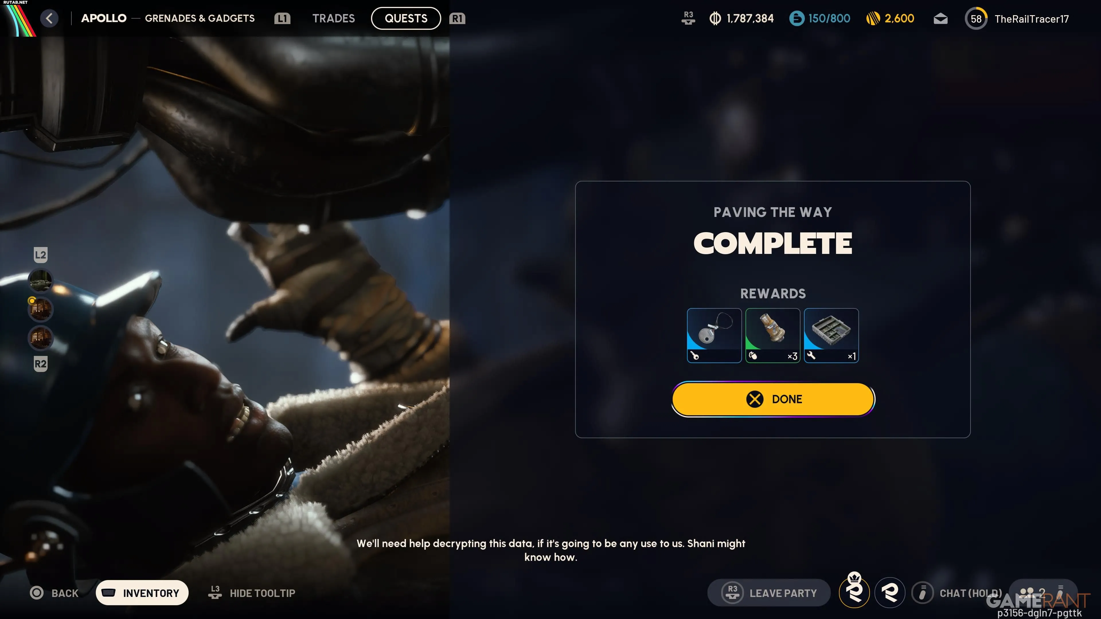На шестом этаже этого здания, справа, находится квартира исследователя. Внутри нужно взаимодействовать с данными, после чего квест будет выполнен. Вернитесь в Эсперансу и сдайте задание, чтобы получить награды: