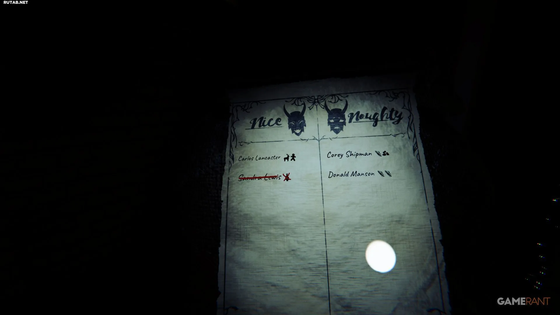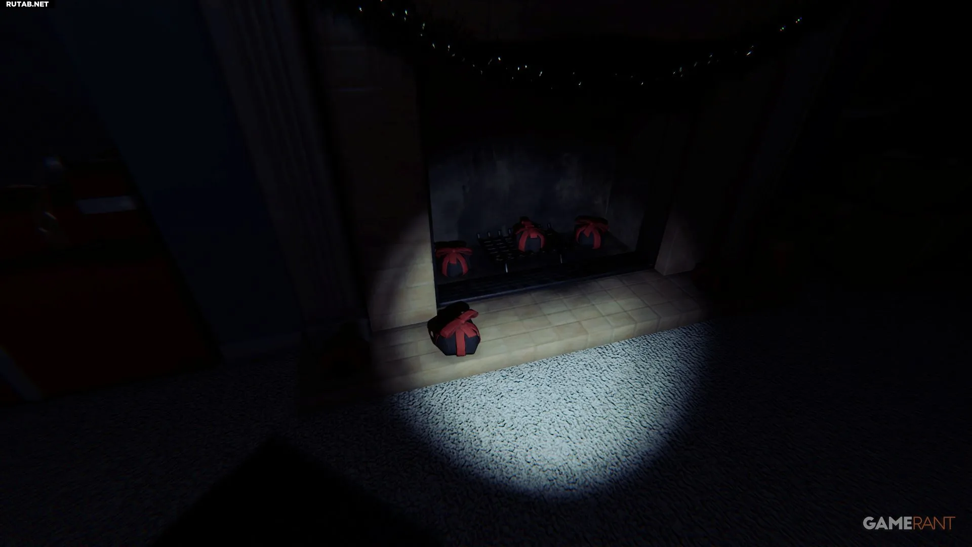 Прямо у входа в локацию вы найдете большой коричневый мешок с прикрепленными списками. Рядом с каждым именем указаны символы — это подарки, которые нужно найти внутри дома.
