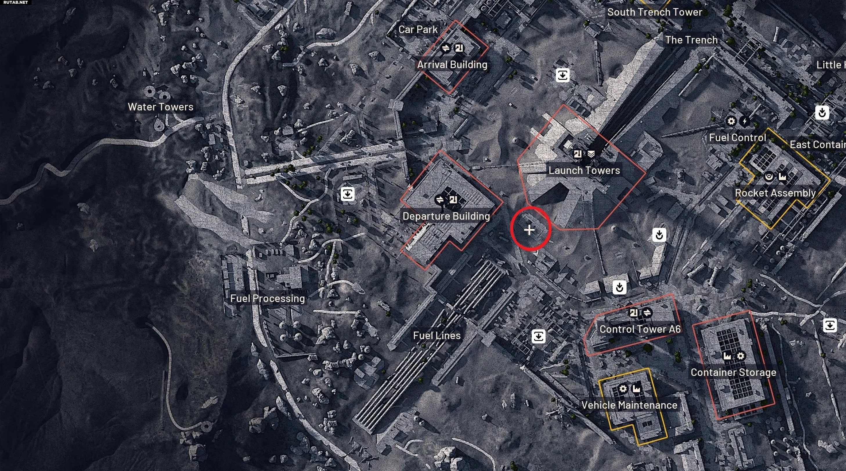 Первая цель — Здание отправления на Космопорте, расположенное в центральной части карты, к западу от Стартовой башни. Лучше сразу подходить к нему с юго-западной стороны.