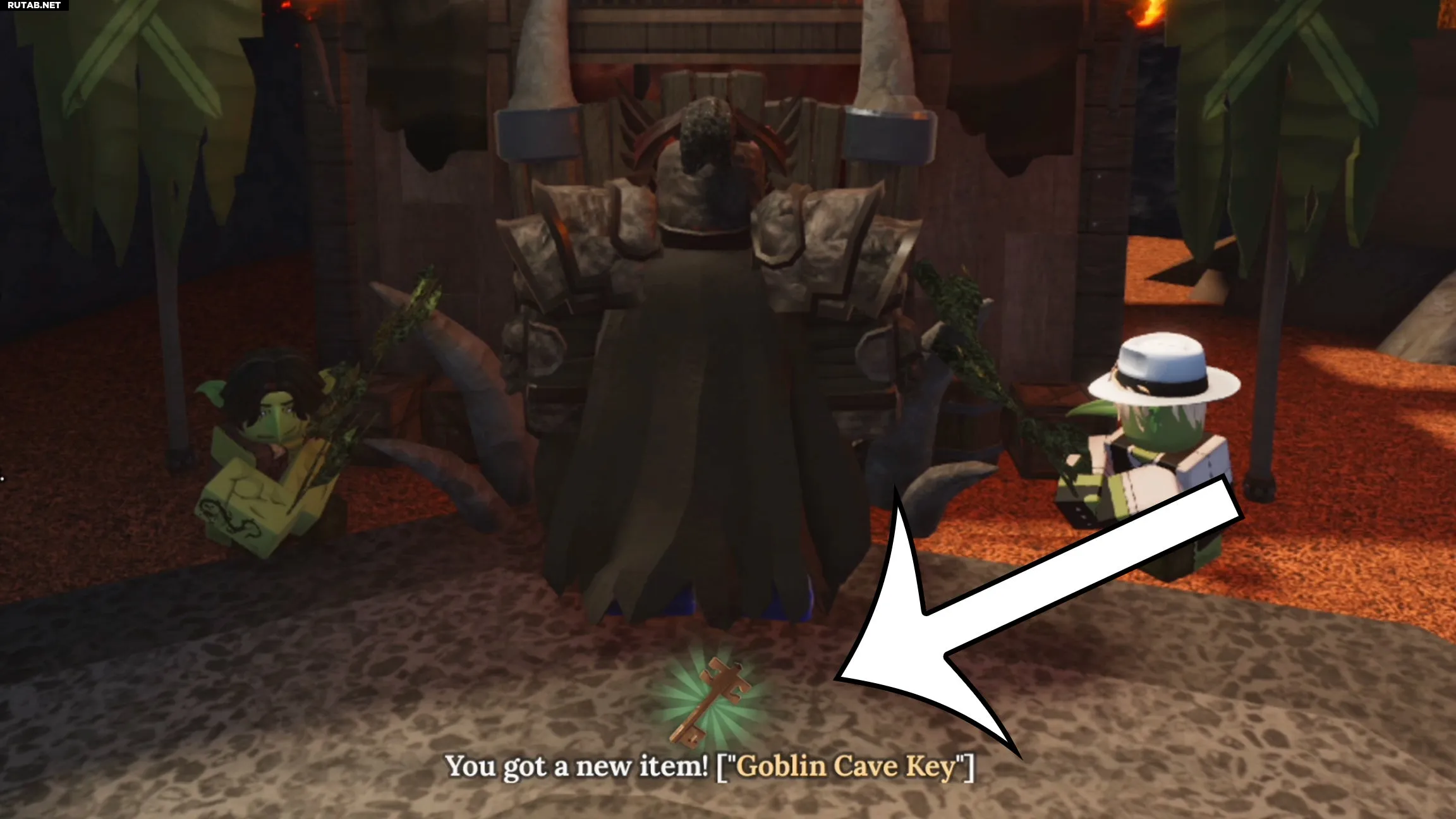 Возможно, вы почувствуете себя обманутым, но прохождение квеста того стоило — на троне остаётся Ключ от пещеры гоблинов. Подойдите к ключу и взаимодействуйте с ним, чтобы поднять, а затем поверните направо — вы увидите запертую дверь.
