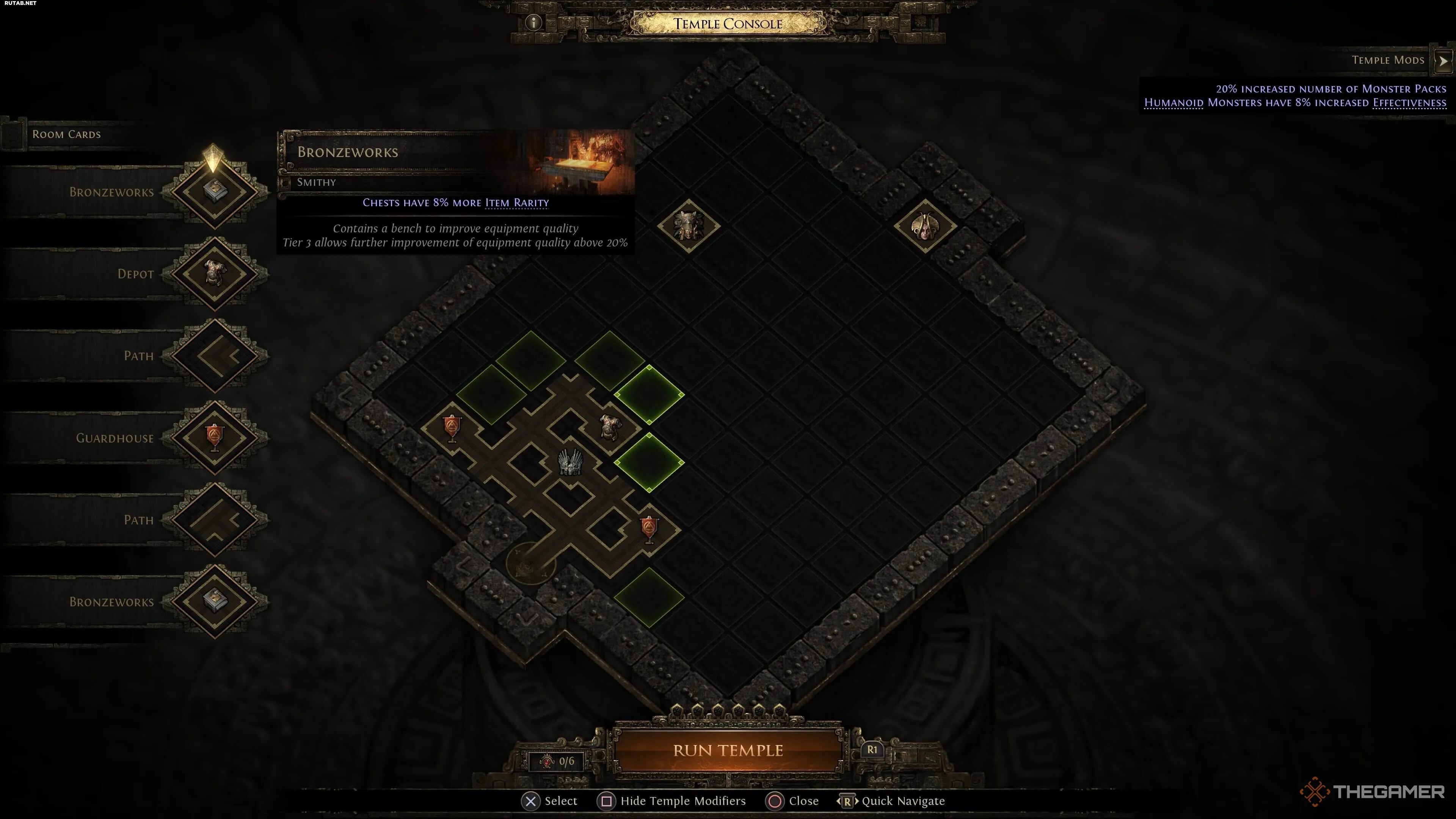 Когда вы взаимодействуете с консолью храма в Руинах ваал, перед вами откроется экран, позволяющий размещать плитки комнат на сетке и соединять их коридорами различной формы. Старайтесь соединять именованные комнаты логичным и осмысленным образом, ведь следующим шагом будет реальное прохождение этого созданного вами подземелья.