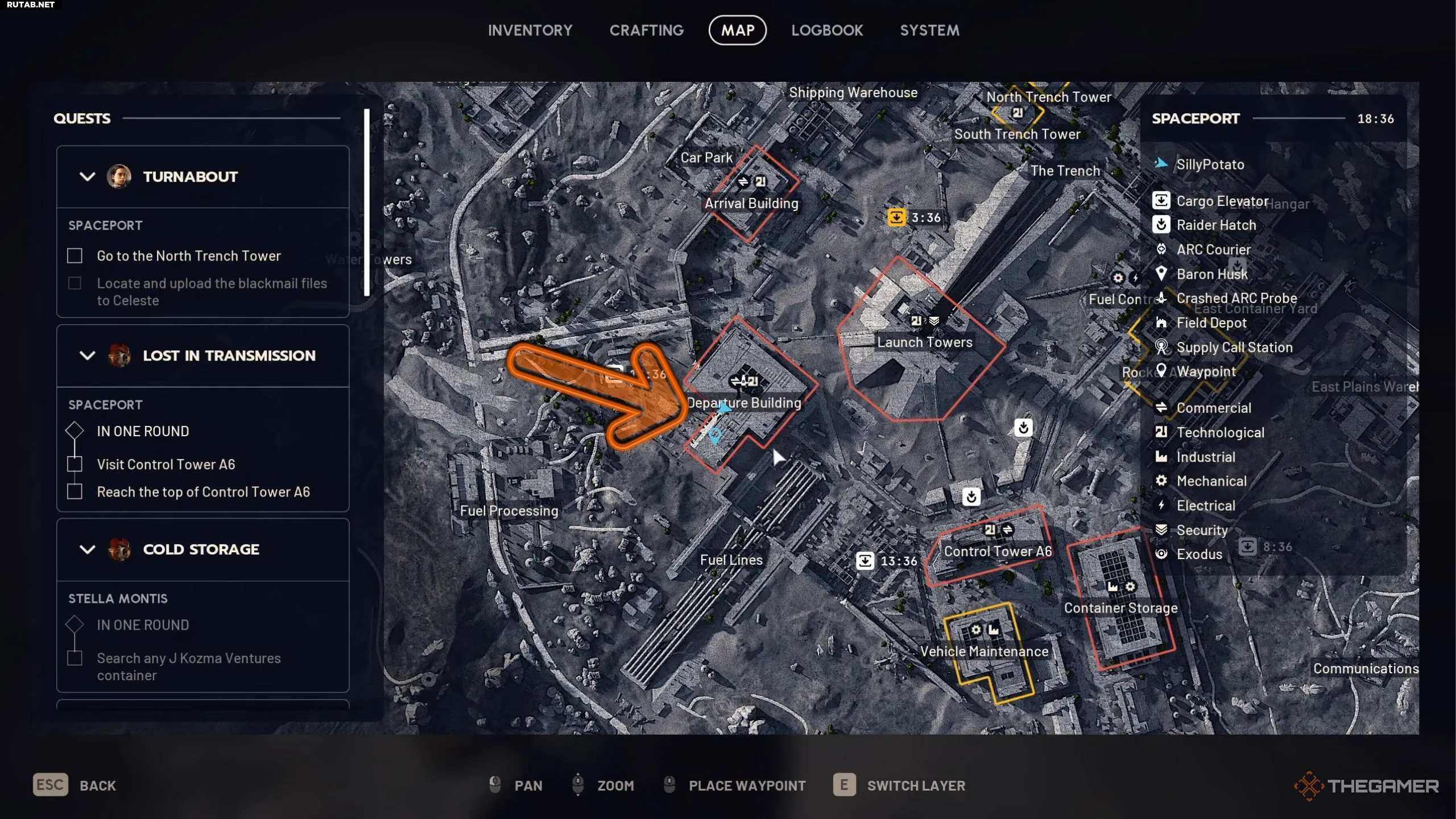 Задание начинается с поиска Комнаты персонала в Здании вылета на Космопорте. Это большое здание в центральной части карты, отмеченное красным контуром.