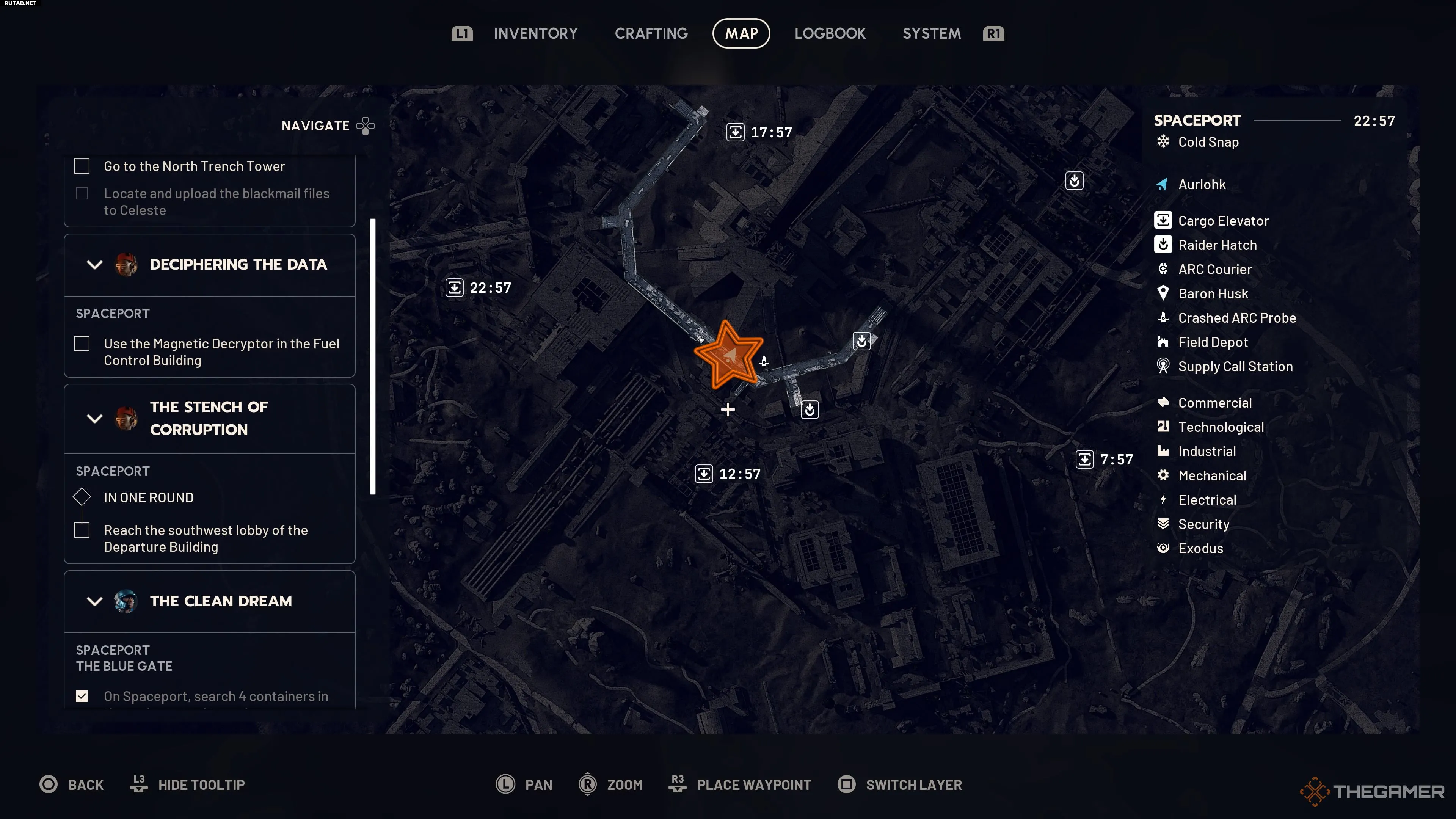 Системы фильтрации — это большие бежевые резервуары с надписями. При приближении к любому из них появится подсказка проверить систему. Сделайте это, и цели квеста на Космопорте будут выполнены.