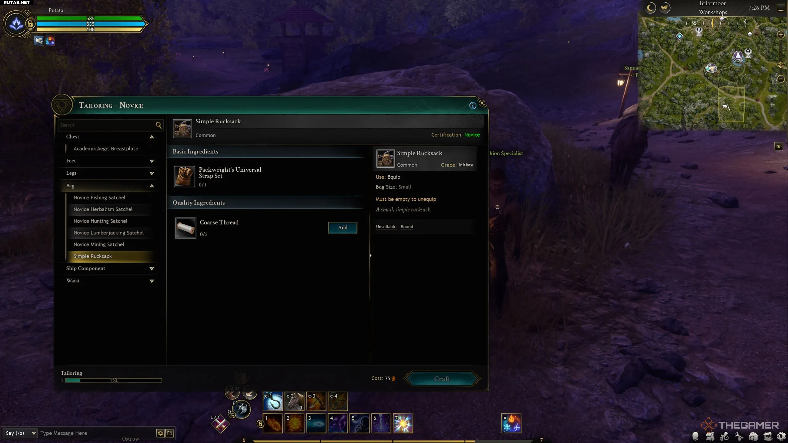 После создания нитей подойдите к станку для пошива одежды. В выпадающем меню «Сумки» выберите создание «Простого рюкзака». Предоставьте все необходимые компоненты, и через несколько секунд рюкзак будет готов.