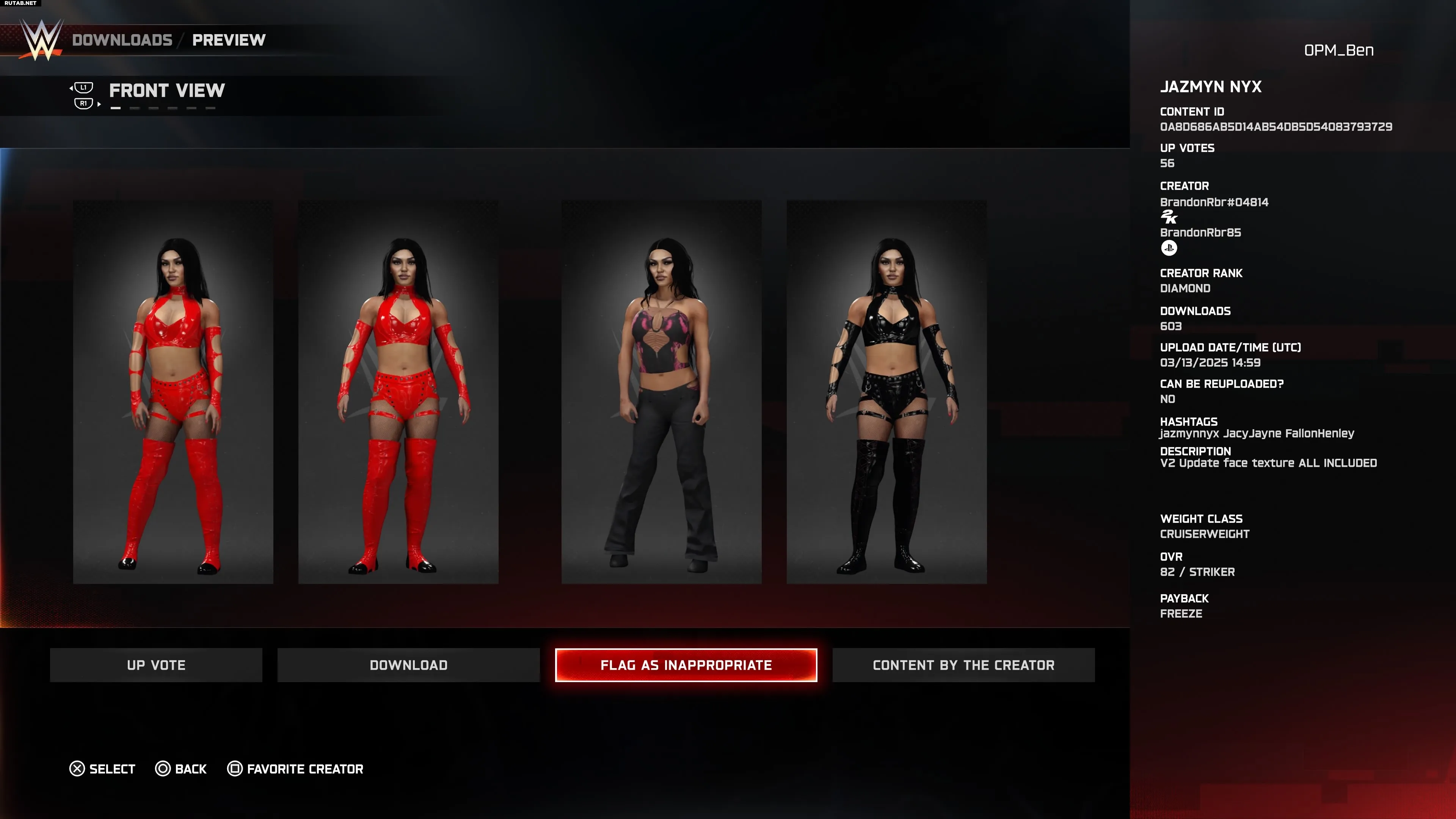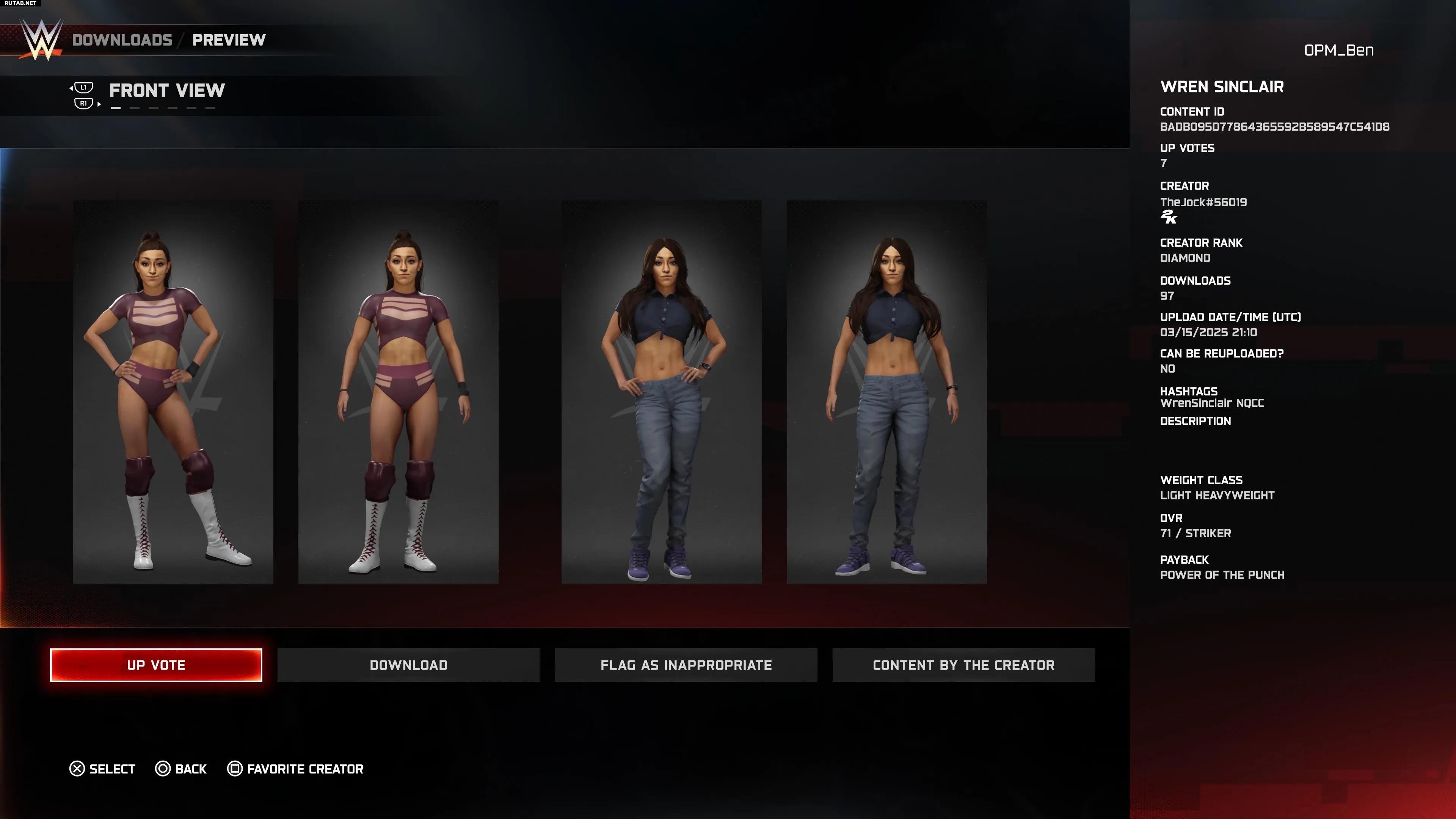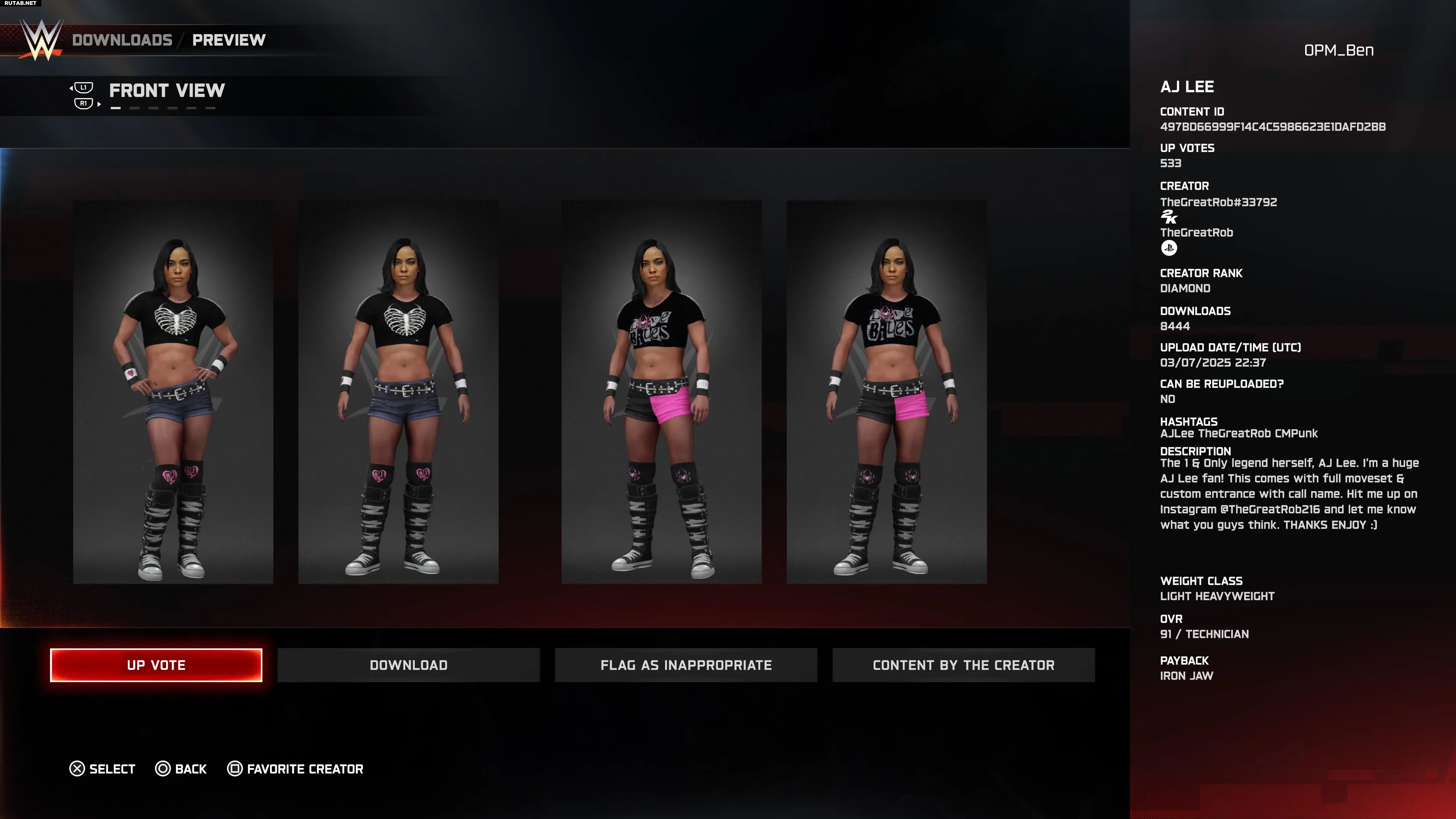 Шотландская звезда TNA добилась успеха в NXT в 2024 году, что привело к её неожиданному появлению на «Королевской битве» 2025 года. Поэтому многие ожидали увидеть её в составе DLC для WWE 2K25, но, к удивлению, её не оказалось в списке сезонного пропуска. К счастью, эта работа от DoggFayce включает точные костюмы, анимацию, набор приёмов и даже таблички болельщиков. Скачивайте смело.