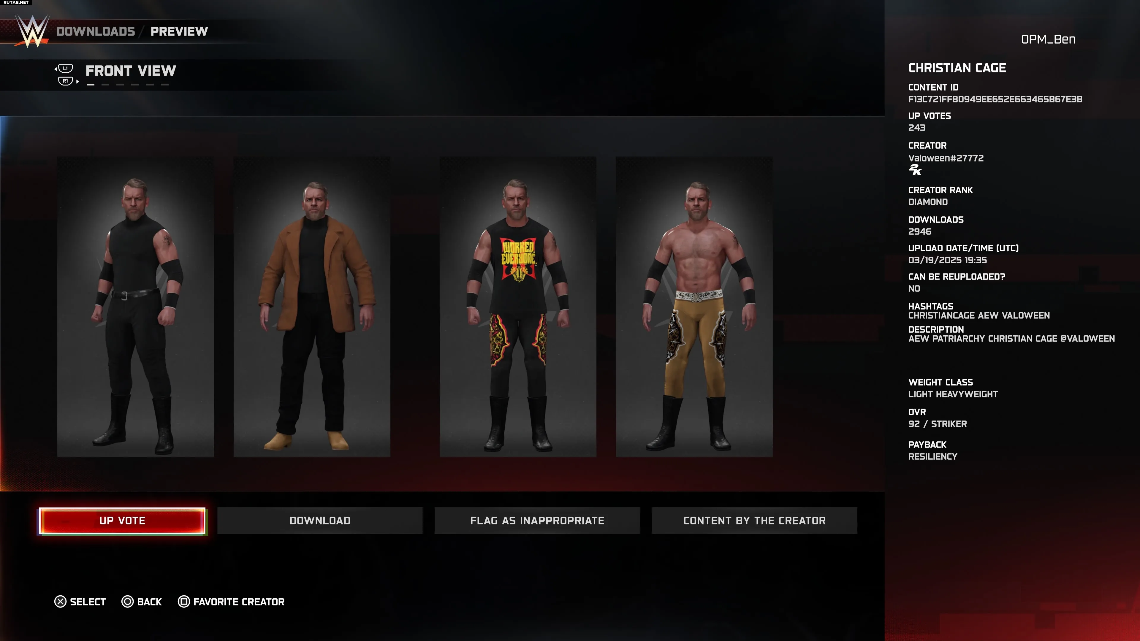 Одной из звёзд этого года среди создателей стал пользователь Valoween. Он создал смесь любимцев WWE прошлого и настоящего, включая вечного Кристиана, который переживает один из лучших периодов своей карьеры в составе ростеров AEW. Этот пользовательский персонаж включает четыре костюма на выбор.