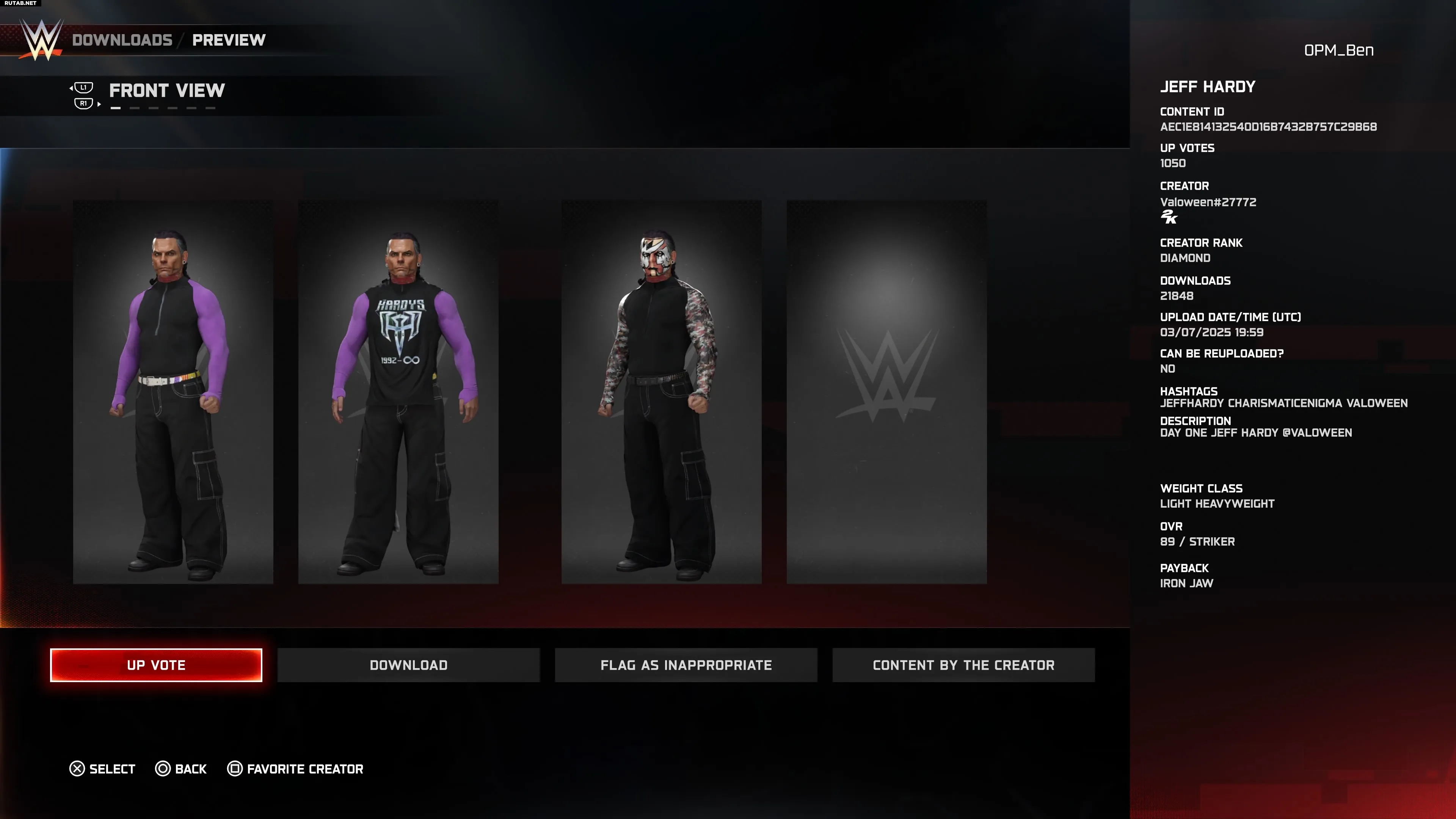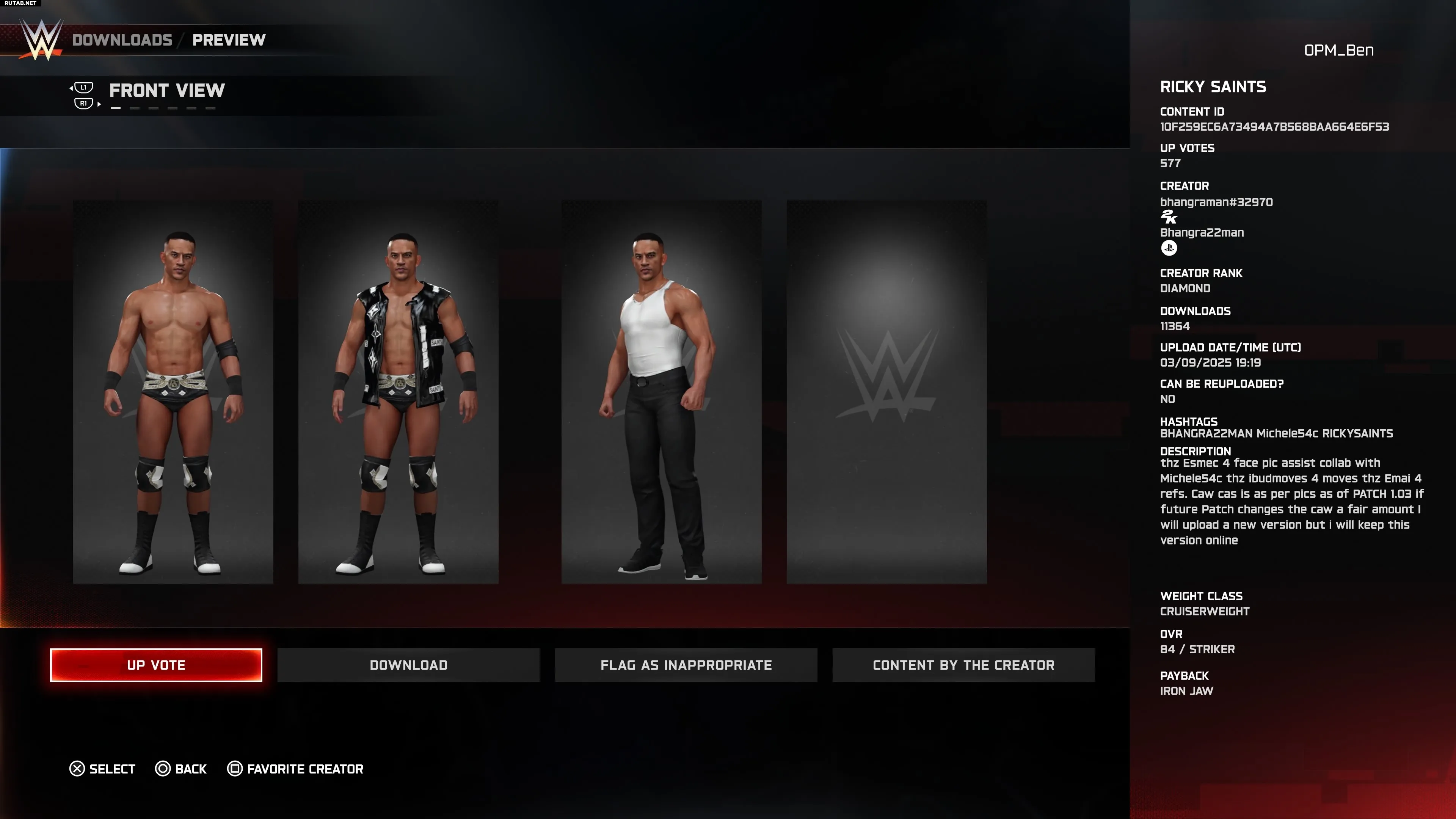 bhangraman— постоянный участник этого ежегодного списка, и его качественная работа продолжается с последним переходом из AEW в NXT. Рики Старкс теперь известен как Рики Сэйнтс и провёл отличный год на третьем бренде WWE. Этот пользовательский персонаж создан в коллаборации с Michele54c, включает изображение лица от Esmec и набор приёмов от ibudmoves.