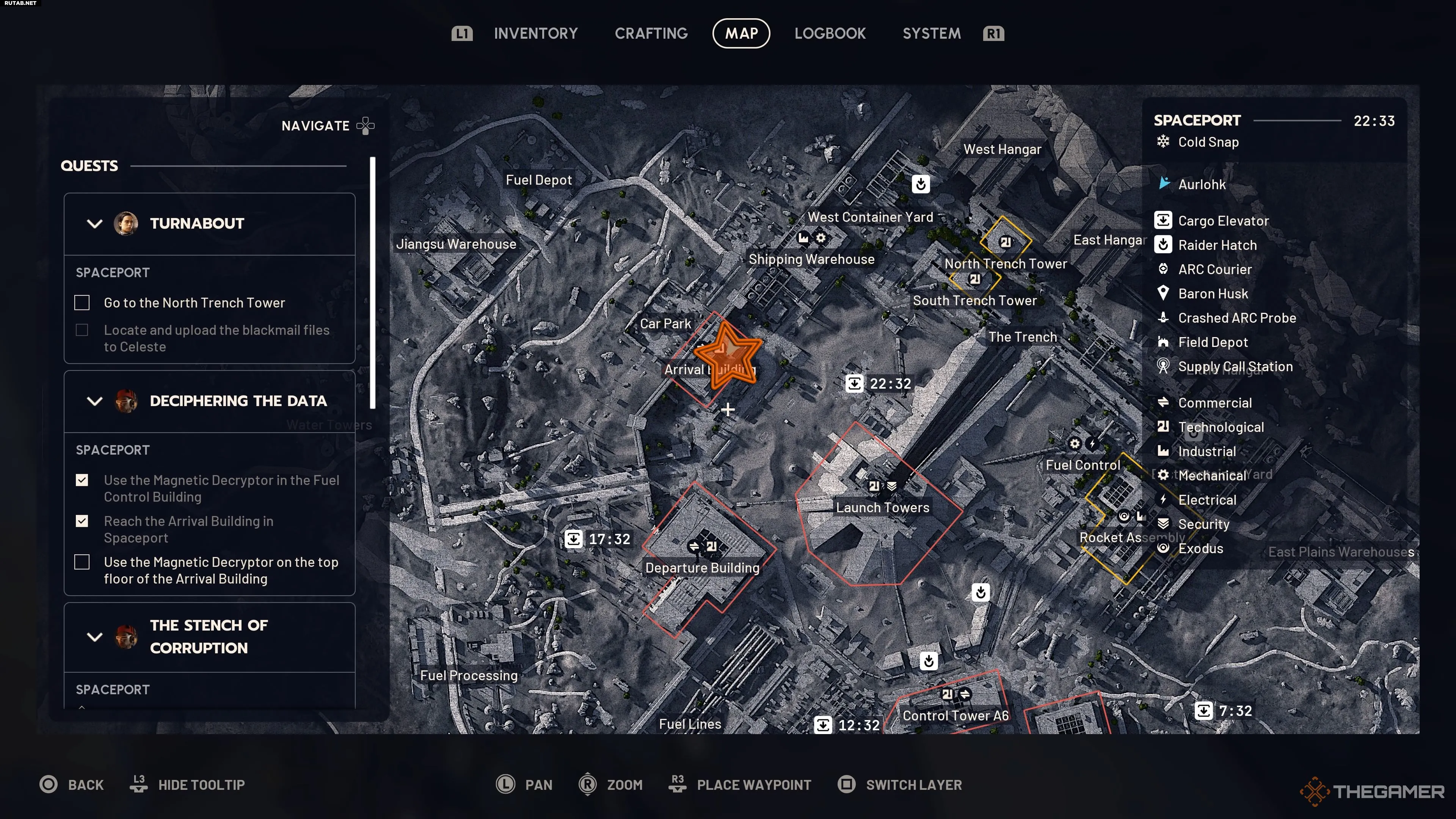 Квест «Расшифровать данные» от Шани полностью проходит в Космопорту. Направляйтесь туда и идите к зданию управления топливом на северо-востоке карты, рядом со сборкой ракет.