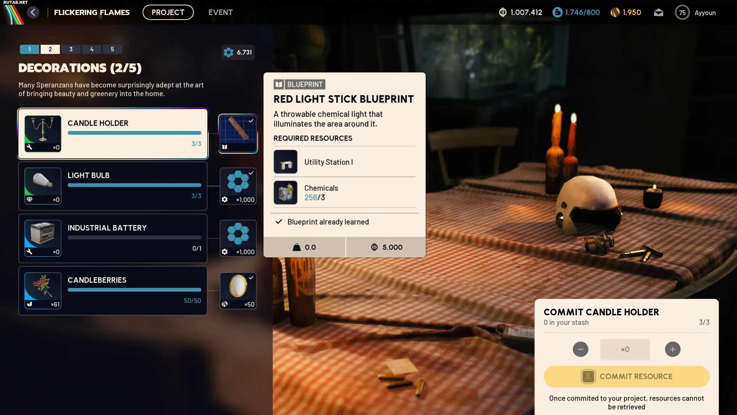 Собрав три подсвечника, пожертвуйте их во вкладке «Украшения» события «Мерцающие огни». В награду вы получите чертёж для «Красной светящейся палки». Его можно оставить для коллекции или продать за 5000 монет.