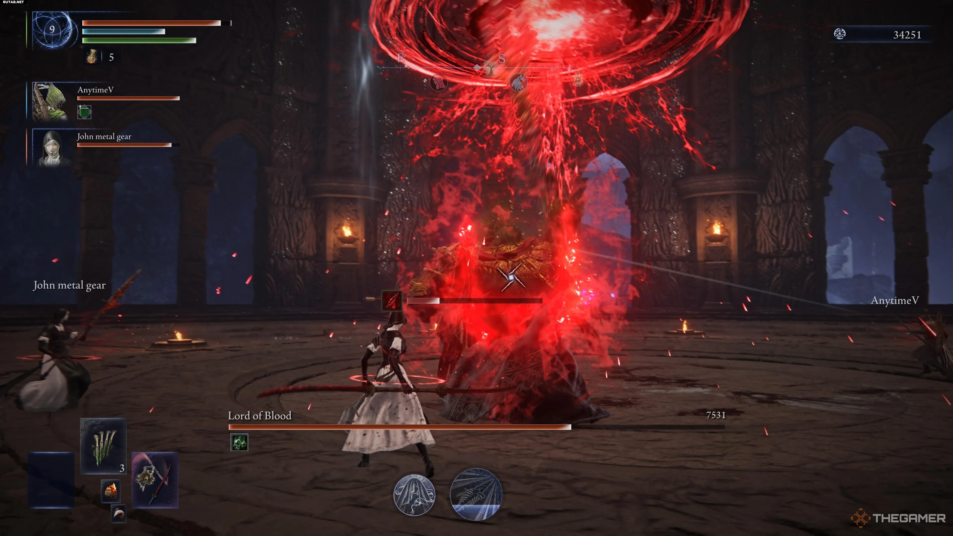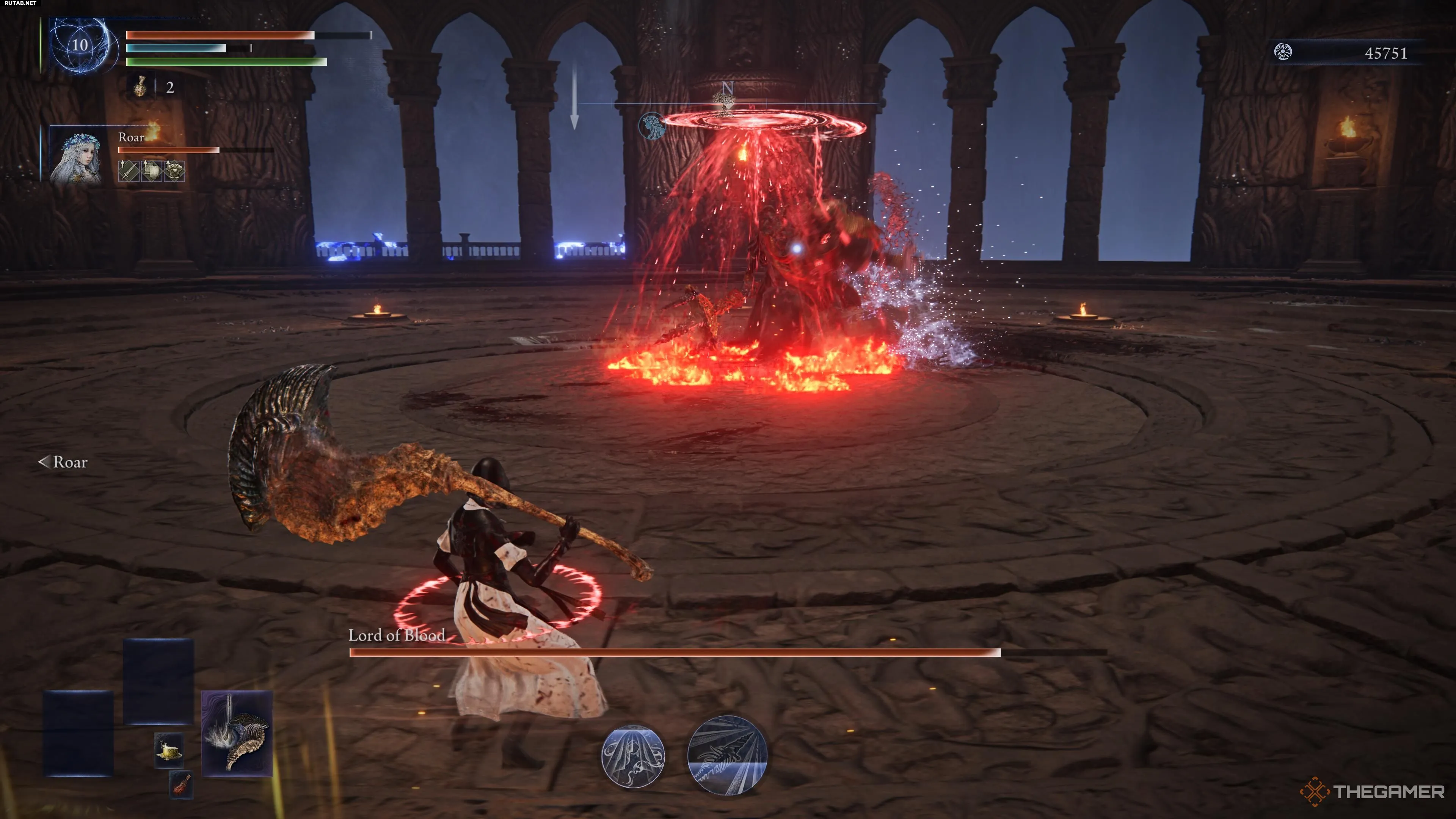 По мере нанесения урона вы заметите, что босс поднимет оружие, произнесёт число и проведёт небольшой ритуал, призывающий красное кольцо рядом с вашим персонажем. Это неизбежно, и будьте готовы, потому что, когда вы получите три таких кольца, Повелитель Крови активирует атаку, от которой невозможно защититься — только настойка «Физик» с эффектом снижения урона может предотвратить один из ударов, но не все.