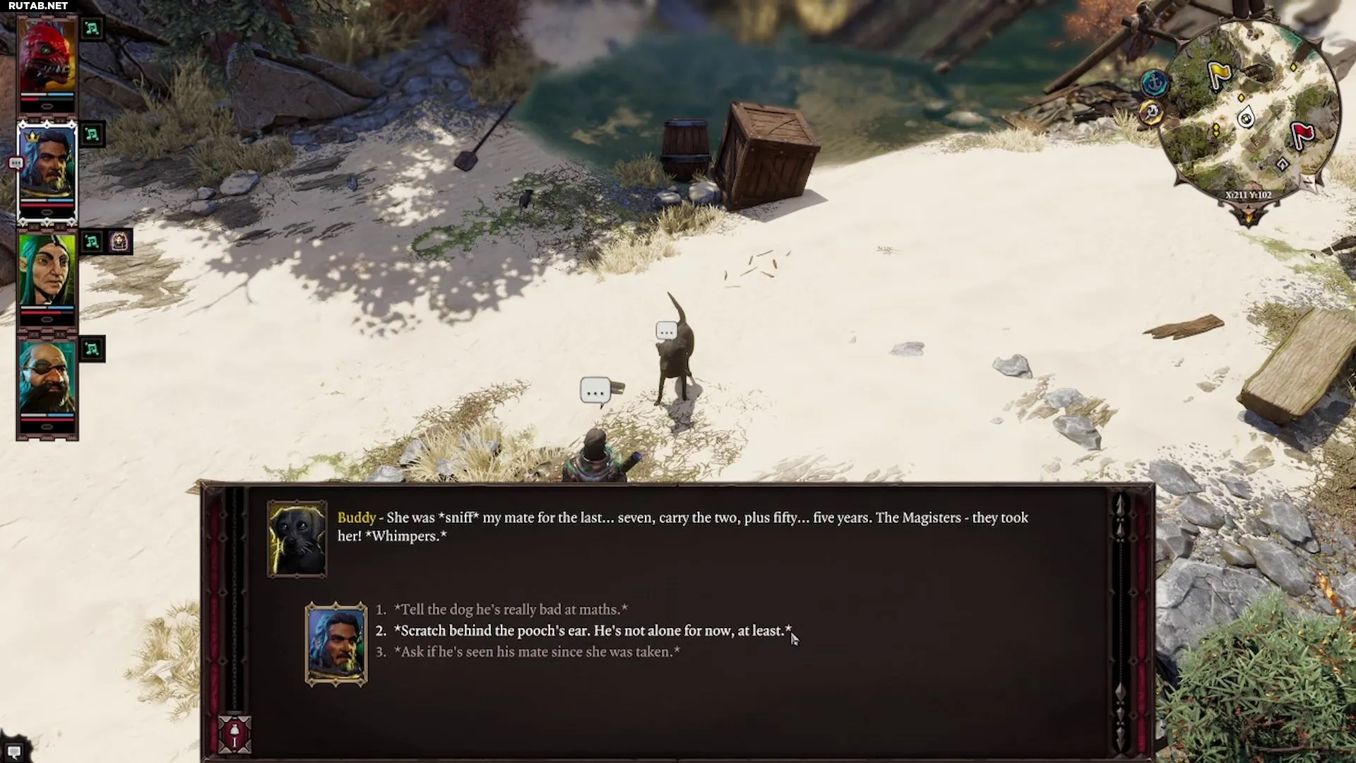 Важно: Бадди не станет разговаривать, если за вами следует Черный кот. Чтобы обойти это, отведите кота подальше (например, к лагерю Гриффа) с одним из спутников, а затем развяжите и подойдите к Бадди с персонажем, у которого есть «Друг животных».