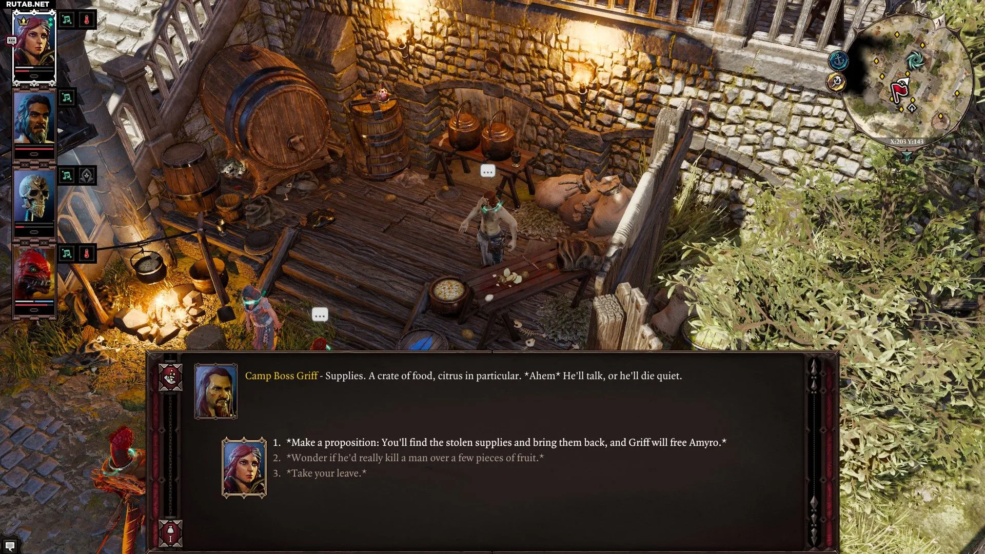 Верните апельсины Гриффу на Кухню лагеря. Он выполнит своё обещание и освободит Амиро. Теперь эльф готов показать путь из Форт-Джоя. Грифф спросит имя вора. Если назвать Стингтейла, за ящером будет послан убийца. Вы можете вмешаться и защитить Стингтейла (если в группе нет Себиллы), но это не обязательно для завершения квеста.