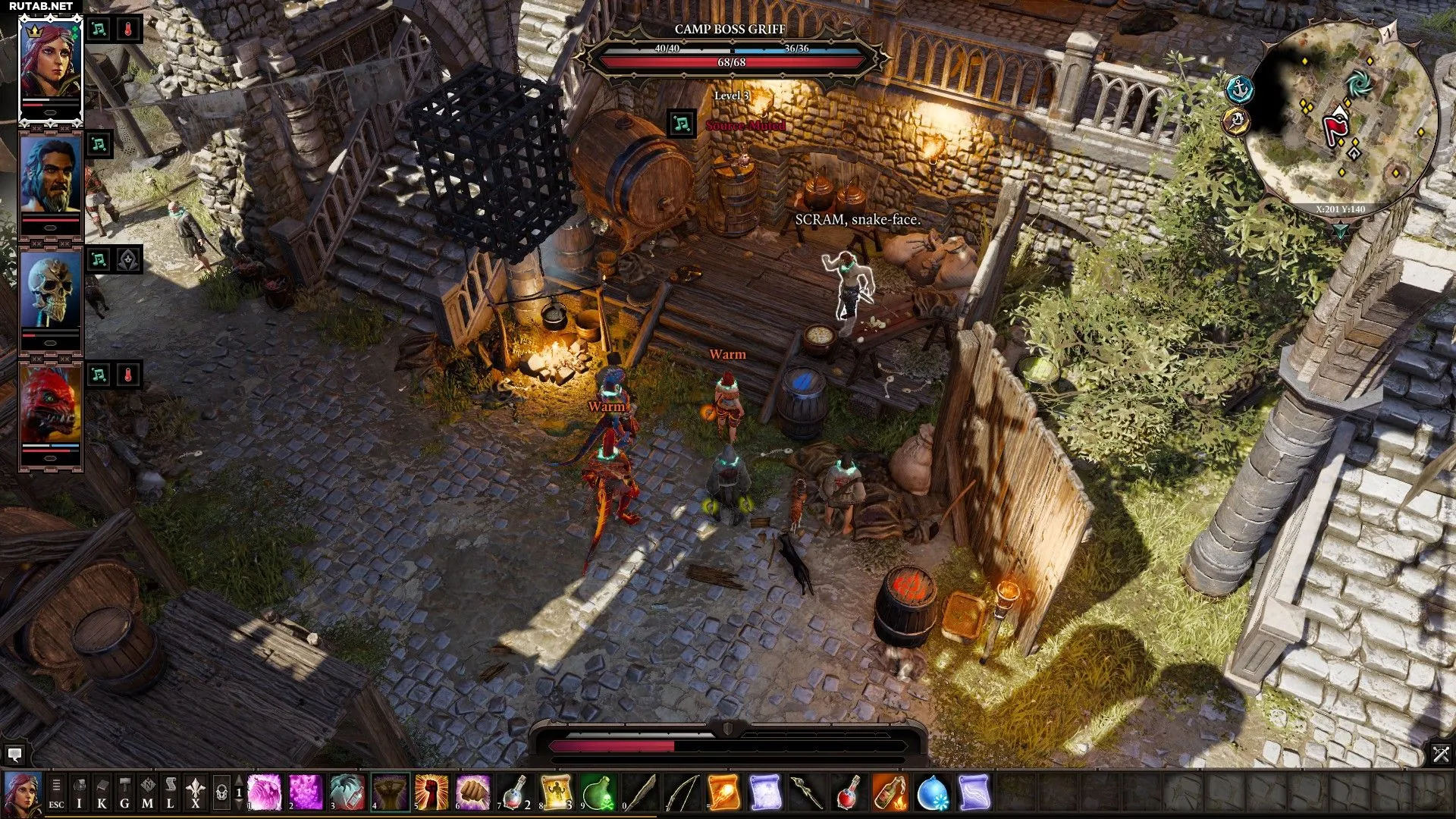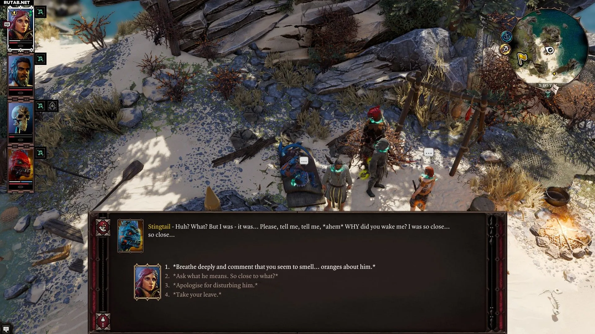 Ящик Гриффа находится в нише к западу от входа в пещеру, но он пуст. Рядом у костра спит ящер по имени Стингтейл — именно у него апельсины. Вы можете: