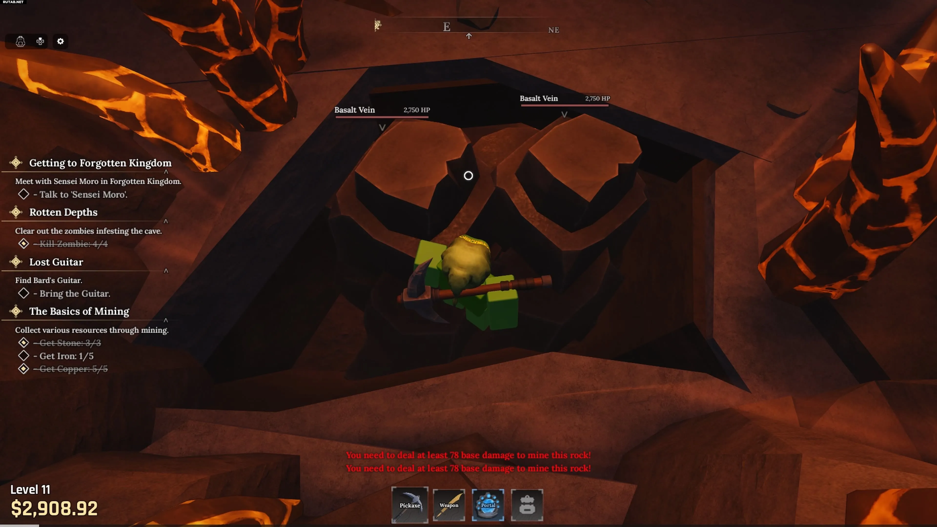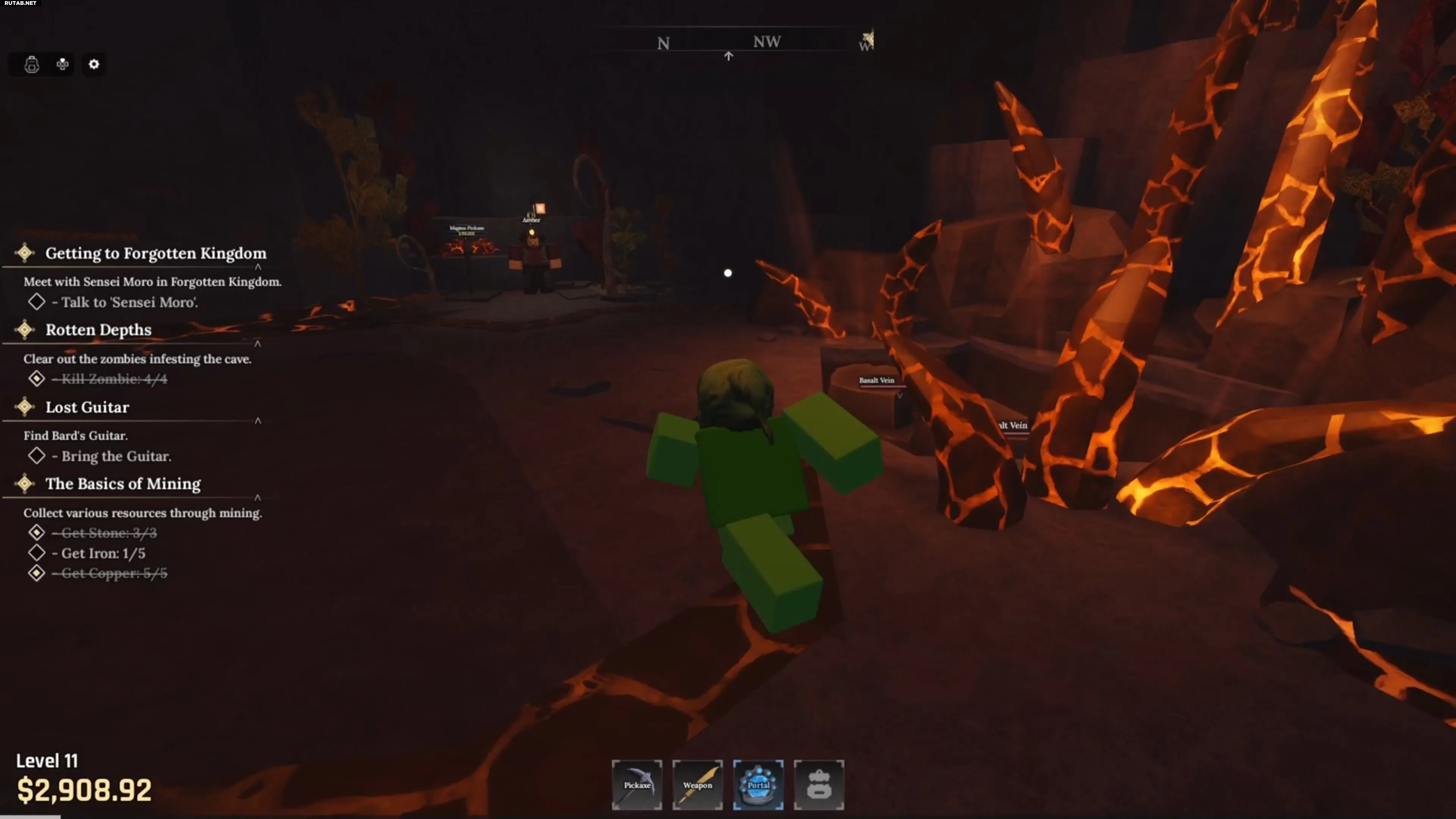 По пути вы встретите NPC по имени Эмбер, рядом с которым продается кирка «Магма». Справа от входа вы увидите несколько базальтовых жил (Basalt Vein), которые необходимо разрушить киркой.