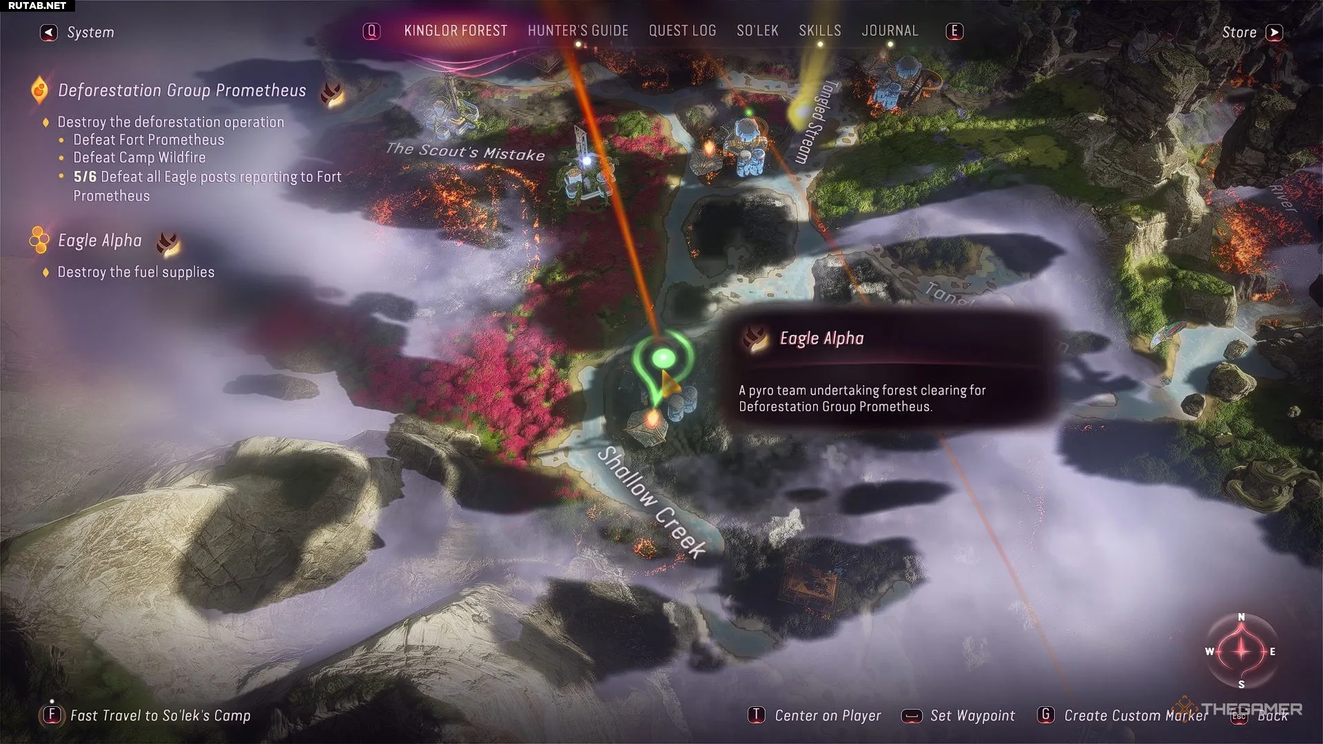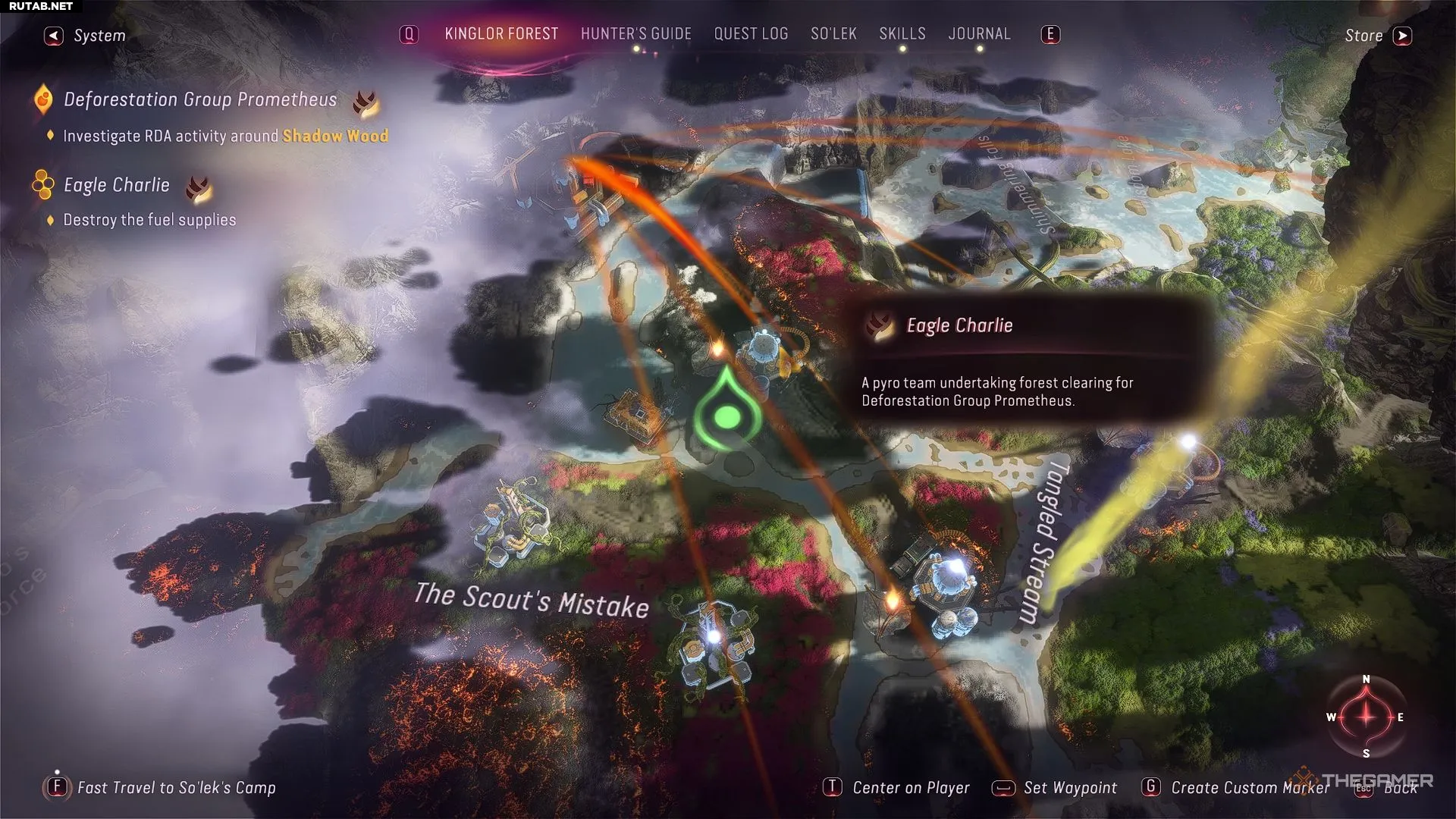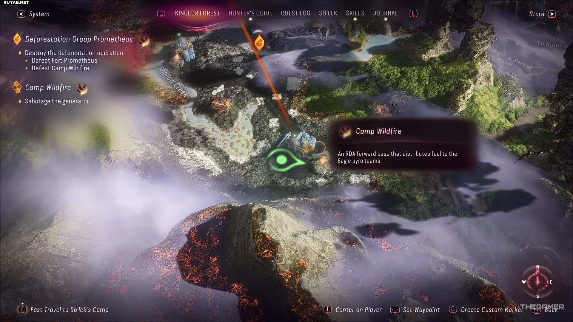К югу от Леса Кинглор, на западной стороне, где вы находили лагеря, расположен лагерь «Лесной Пожар», связанный с более крупным фортом «Прометей». Этот аванпост полон солдат КДР и топлива, и ваша задача — его саботировать.