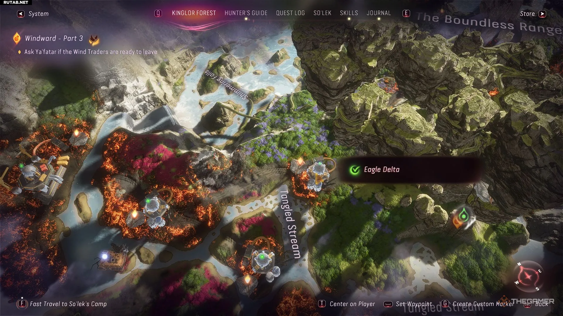 К северу от Ручья Ученика, к востоку от хребта Безбрежных Гор, вы найдёте лагерь «Орёл Браво» среди леса. Здесь много укрытий, чтобы сначала разведать местность, а затем атаковать.