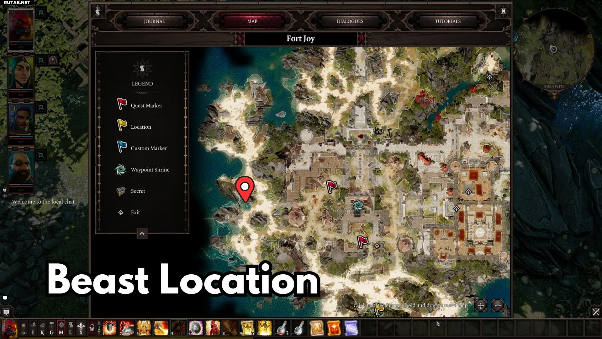 Зверя можно найти за работой у обломков корабля прямо к западу от точки быстрого перемещения «Площадь Форт-Радости» (X:125, Y:163), на пляже к югу от места, где сражаются с солоноводными крокодилами ради перчаток телепортации. Его легко пропустить, если не быть внимательным.