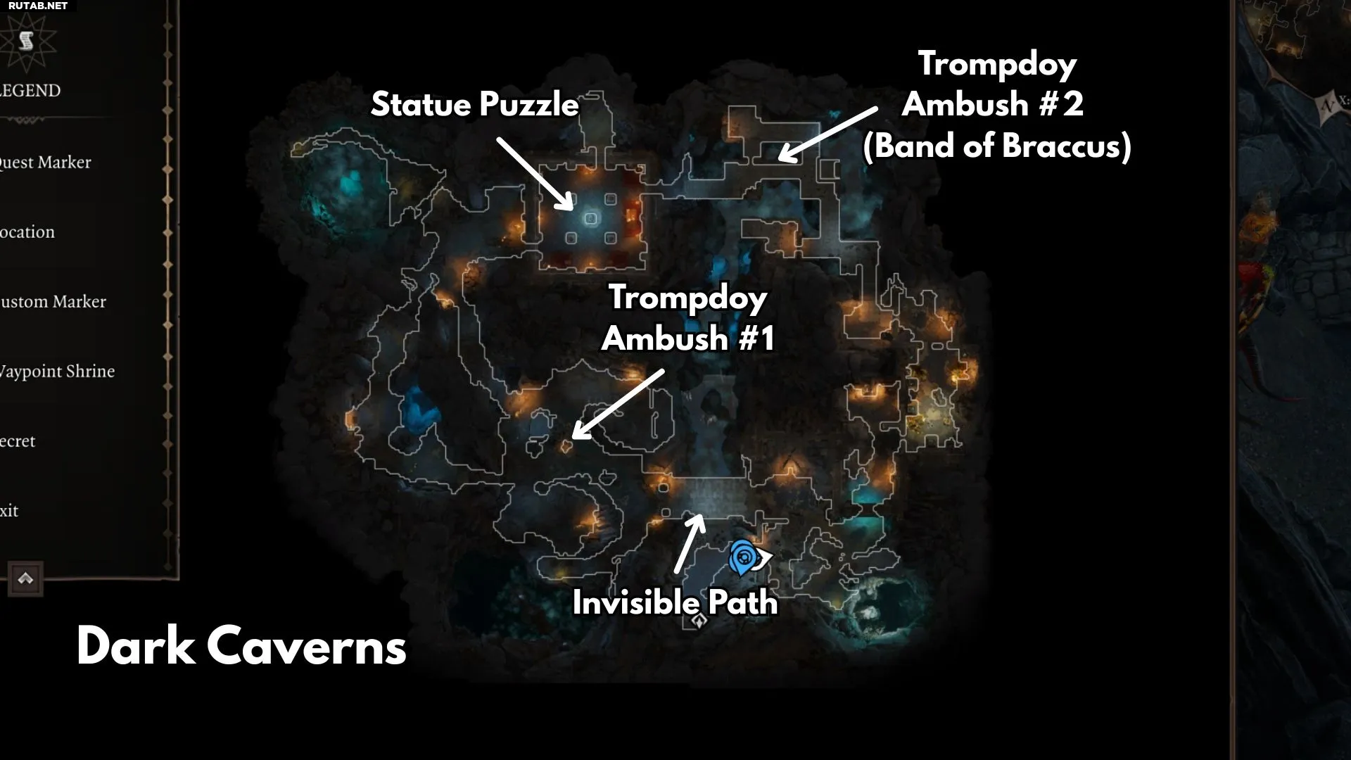 Внутри пещеры, недалеко от входа, вы встретите Тромпдоя, который попытается вас предостеречь. Рядом с ним будут деревянные ящики, а за ними — подземная река. Через реку ведёт невидимая тропа, которая проявляется только при приближении.