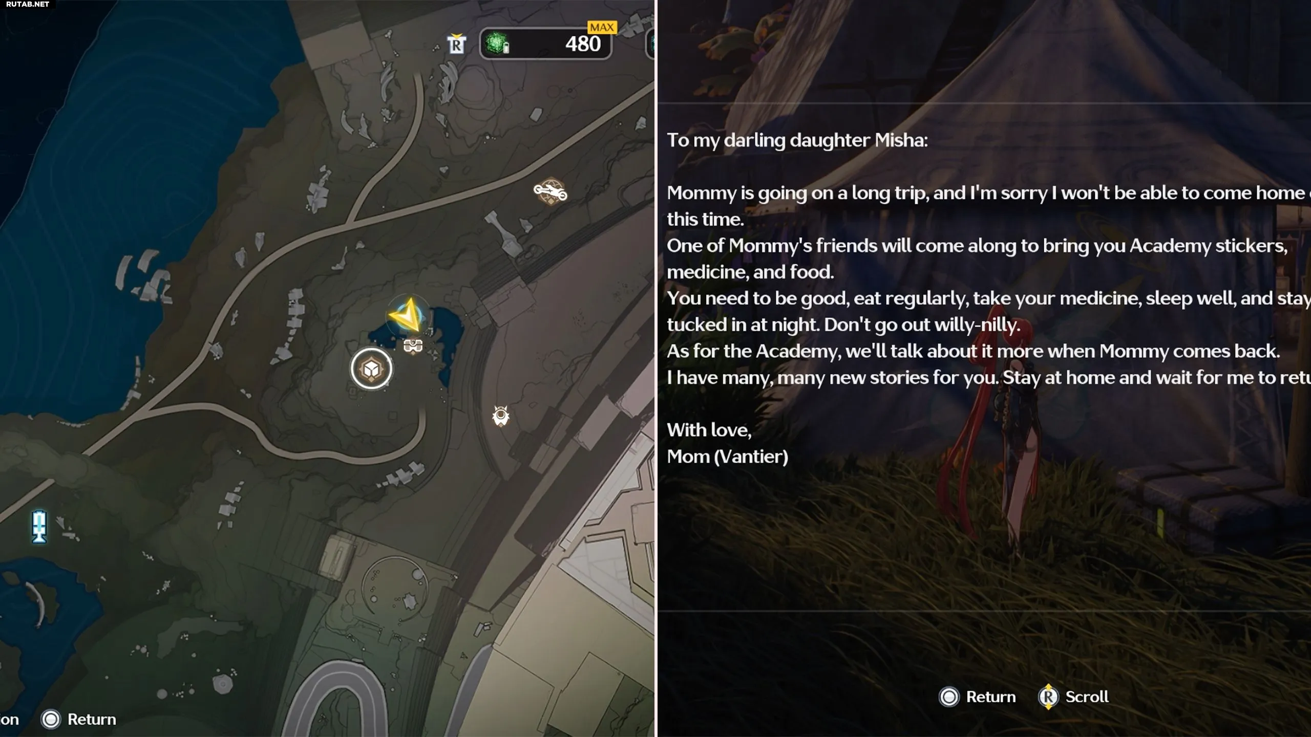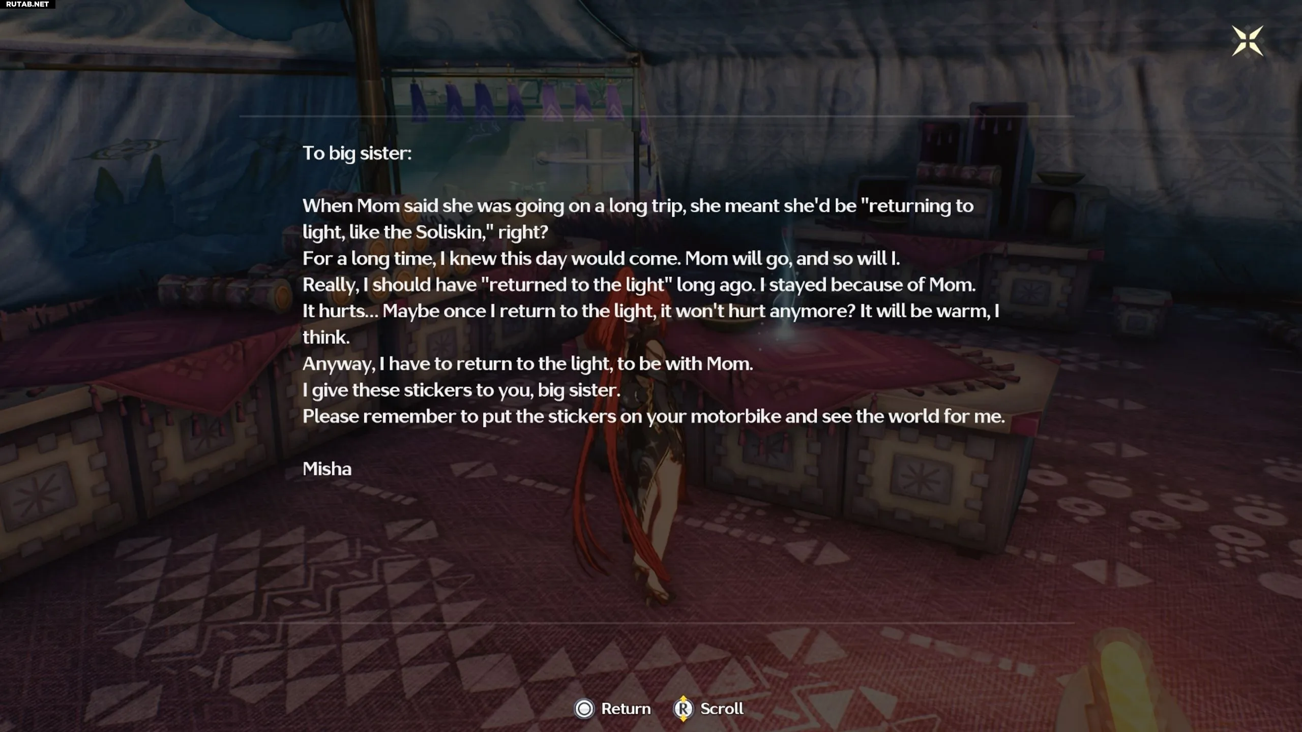 Находясь рядом с Изгибом Ребра, идите на северо-восток, чтобы найти второй лагерь с ещё большим количеством врагов. Осмотрите наклейку на палатке, чтобы обнаружить письмо от матери Миши.