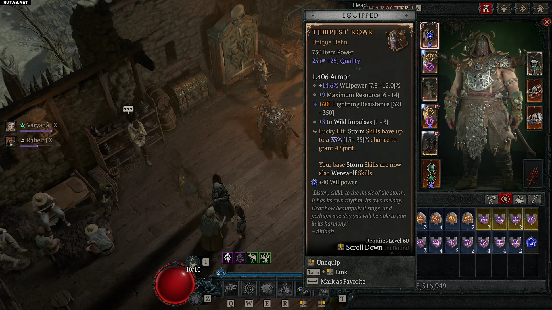 Этот уникальный шлем (выпадает с Дуриэля) делает все ваши штормовые умения также умениями оборотня-волка. Это означает, что они будут работать в синергии со всеми эффектами, влияющими на штормовые, природные, звериные умения и умения оборотня-волка. Вариантов для синергии много, но мы фокусируемся на Lightning Storm и Cataclysm в сочетании с многочисленными пассивными умениями и эффектами, связанными с оборотнем-волком и ядом.