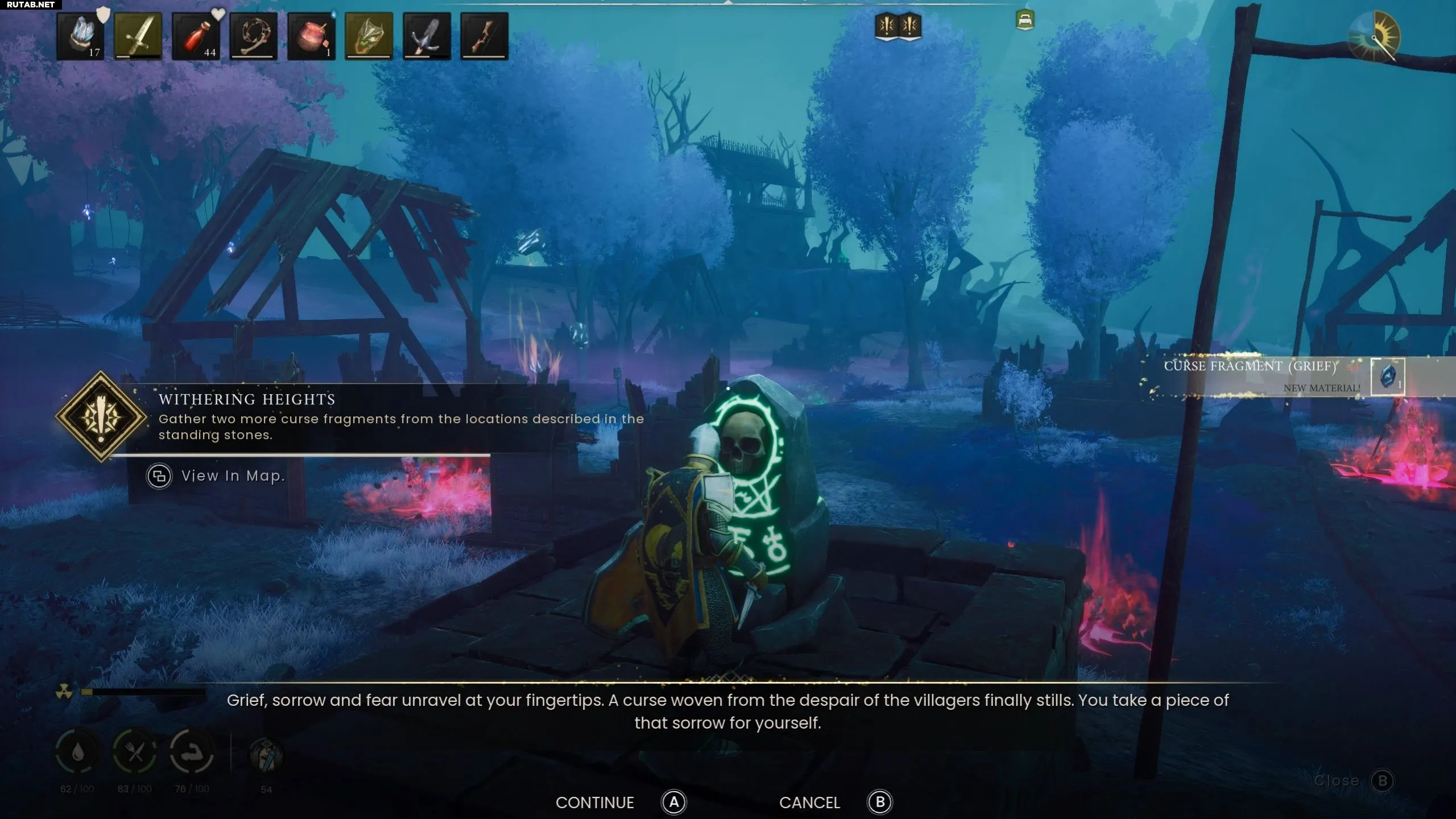 Вернитесь ко входу в Деревню Эмбервуд. Вы увидите, что все четыре святилища светятся, а барьер исчез. Зайдите в деревню и заберите Проклятый фрагмент (Скорбь) из светящегося зелёного камня. Теперь вы на шаг ближе к завершению квеста «Увядающие высоты».