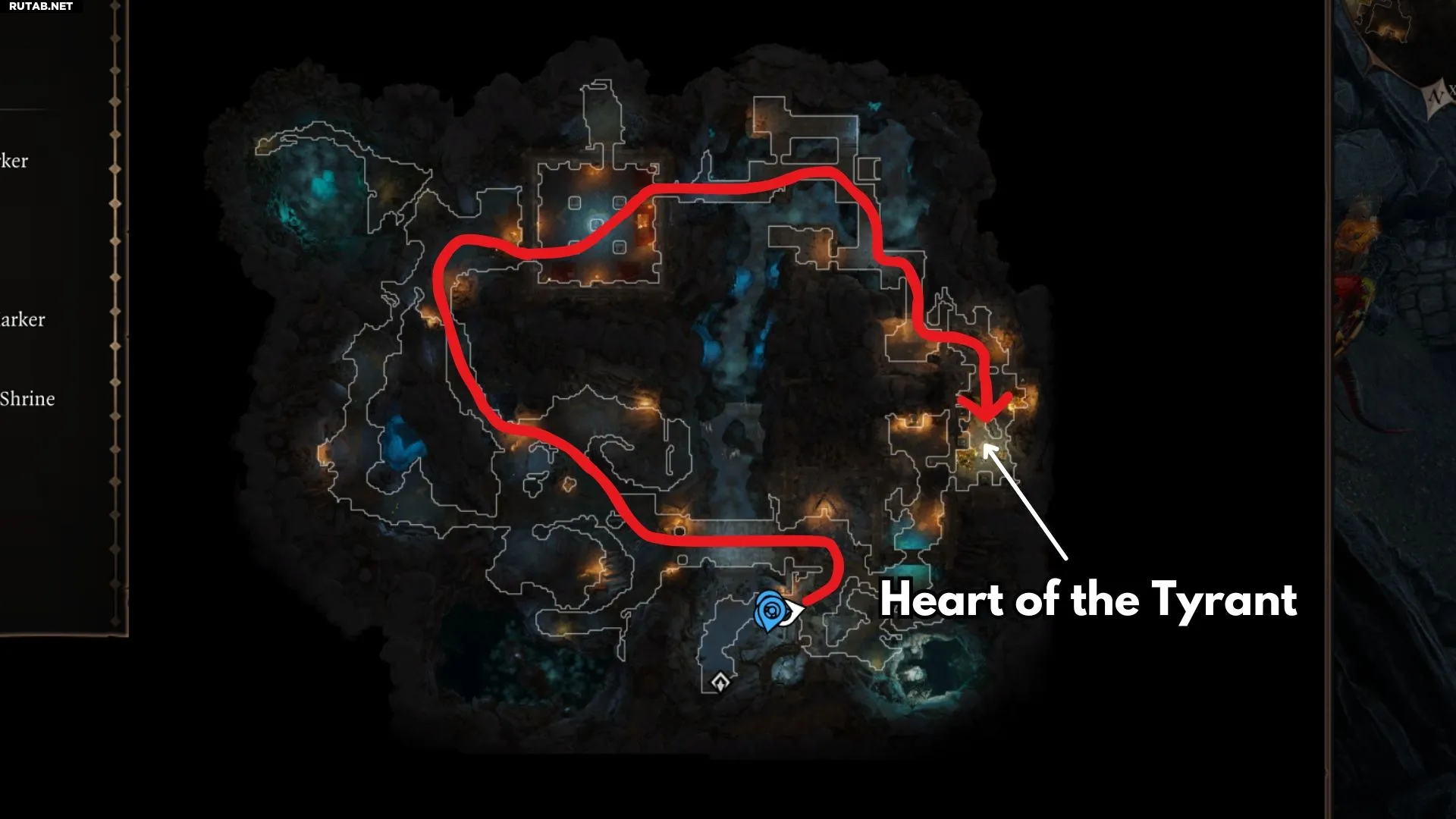 Сокровищница, в которой находится Сердце Тирана, расположена в самом конце этого подземелья. Чтобы добраться до неё, следуйте по маршруту, показанному выше. По пути вас дважды атакуют иллюзии Тромпдоя, а для прохода через пещеру придётся решить загадку статуи. Ответы на вопросы статуи: