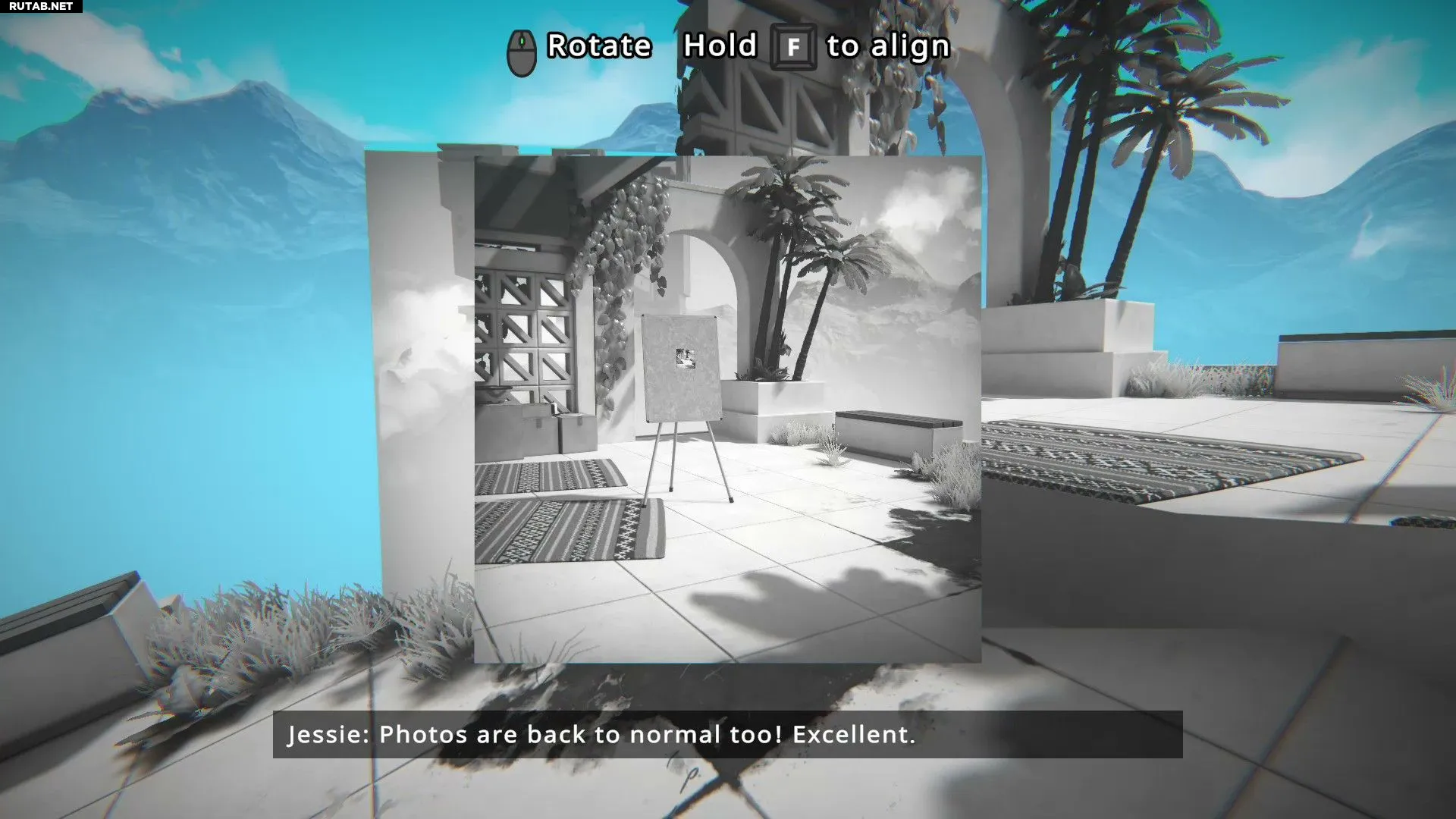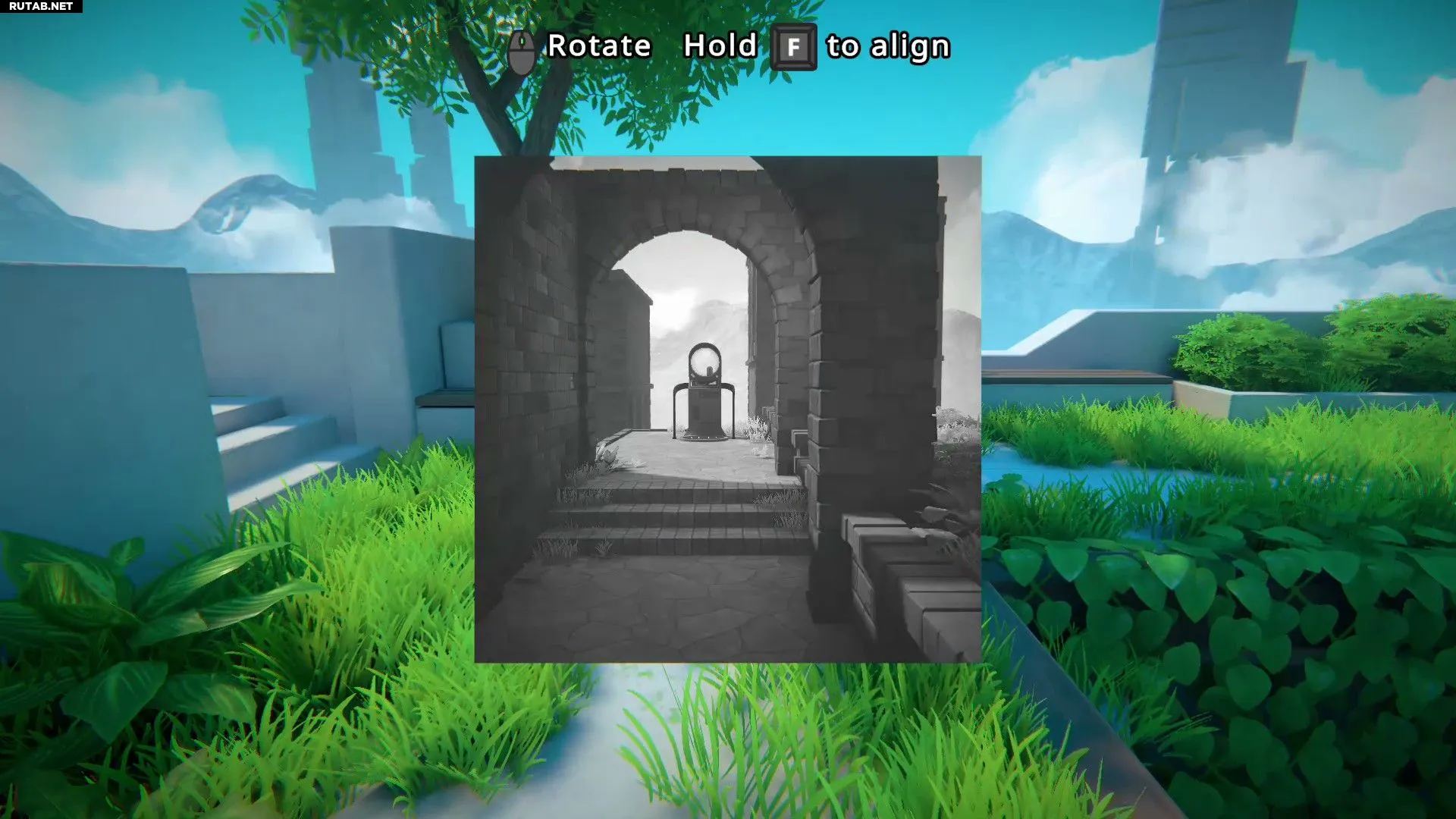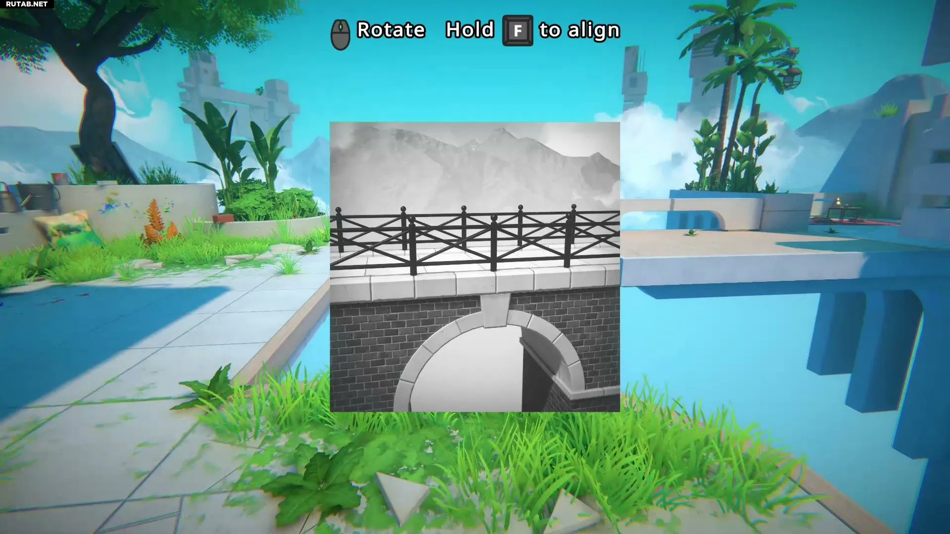 Инстинктивно захочется пройти по центральному мостику, но он обрушится, и герой упадёт в яму. В этот момент игра познакомит с механикой перемотки времени. Нужно перемотать время назад и пройти по одному из двух других мостиков. Затем следует взять фотографию, прикреплённую к доске, разместить её в пространстве и пройти сквозь неё.