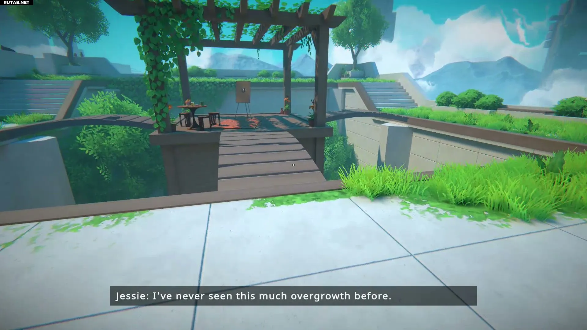 Пройдя через первый телепорт, игроки должны зайти в дом и спуститься вниз на террасу. Посередине они увидят стол и доску, до которой необходимо добраться.