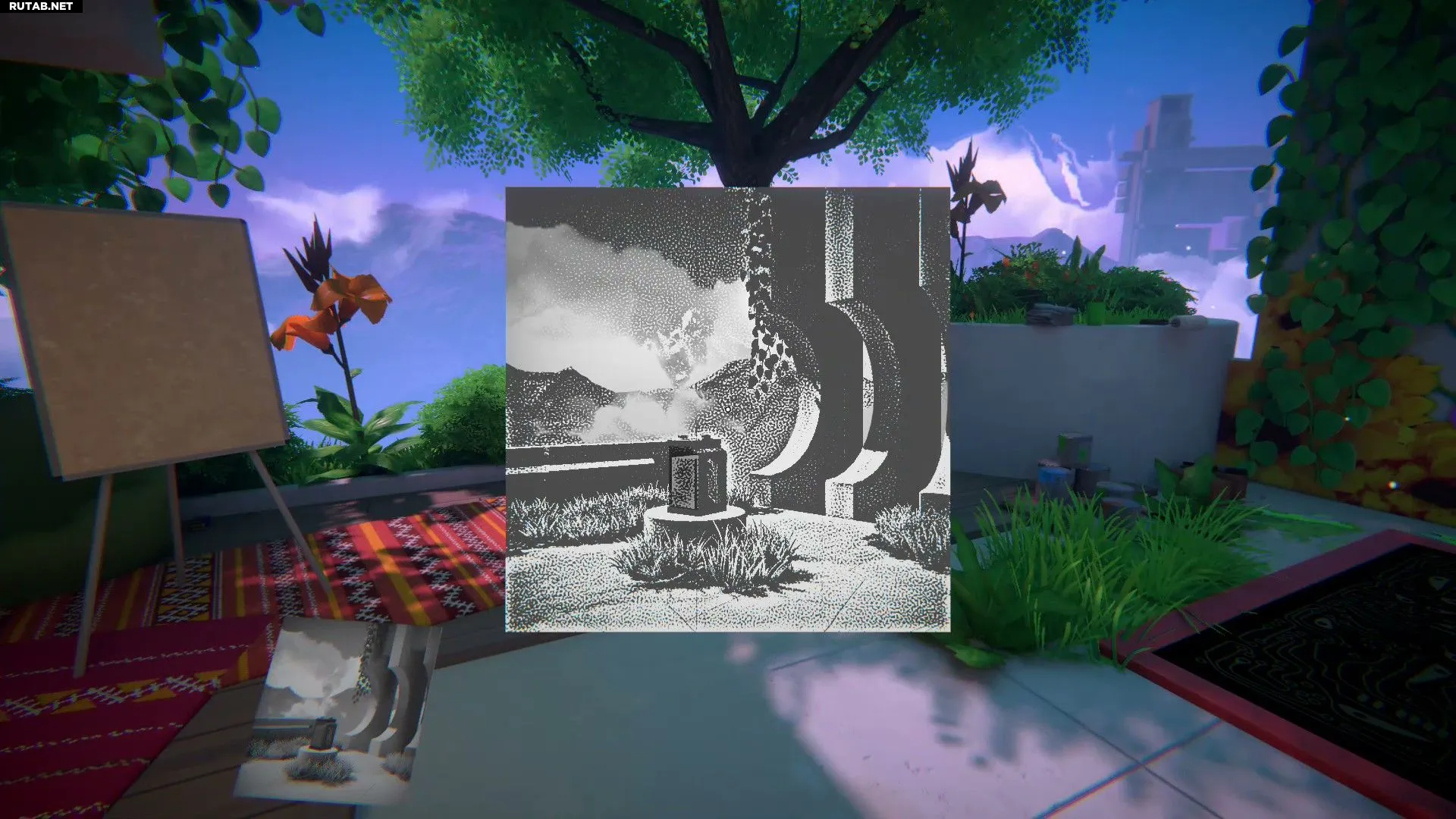 Затем можно перемотать время назад и вернуться к той же картине. Если повернуть её так, чтобы стол с видом на горы оказался перевёрнутым справа, то на нём можно будет найти изображение другого стола. Нужно взять его, повернуть так, чтобы кисть-карандаш оказалась на полу, а затем войти в изображение. Справа будет видна последняя картина.