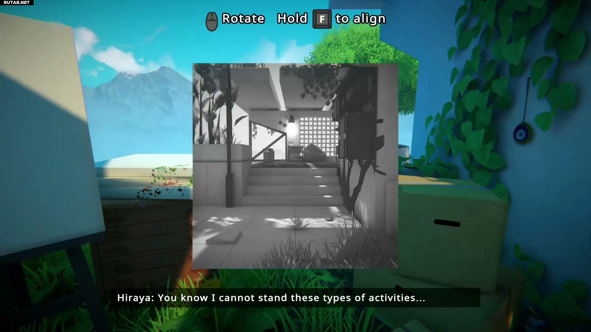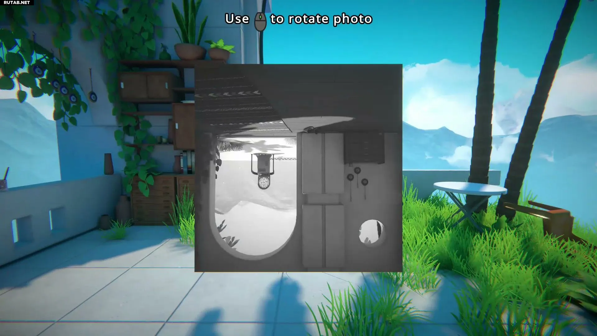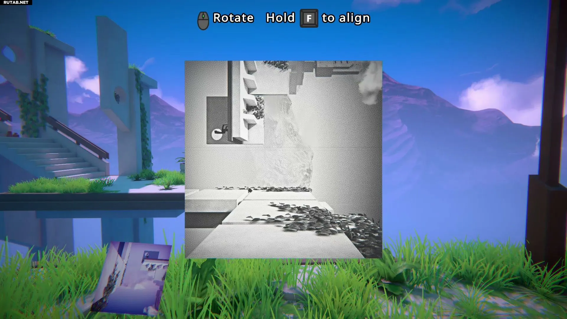 Сначала нужно спуститься по лестнице и взять снимок с маленького столика рядом с диваном. Его необходимо повернуть так, чтобы листва оказалась на полу, а трава — на правой стене. Затем следует войти внутрь и в конце коридора позволить себе упасть вниз.