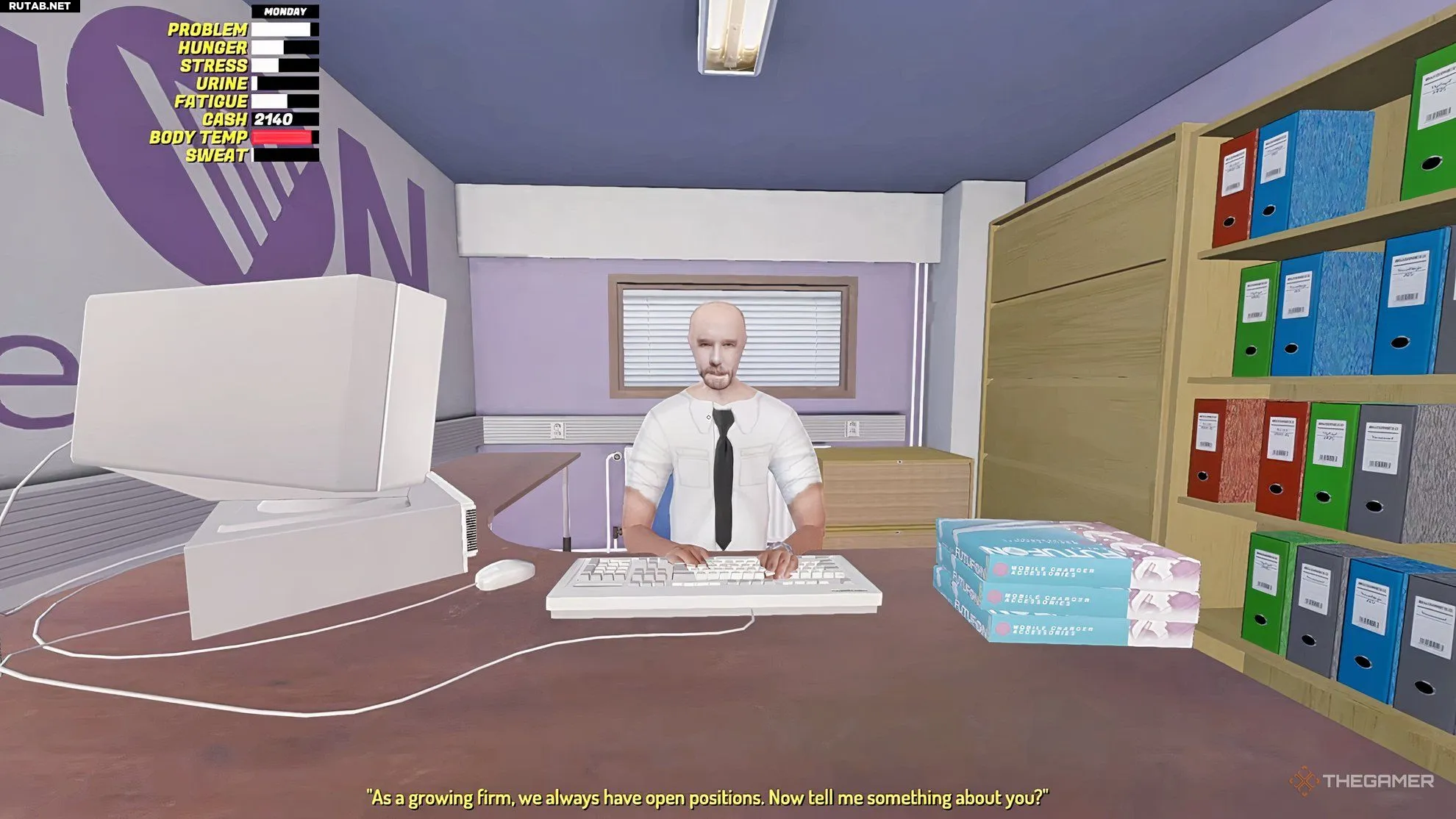 Основная работа находится в здании упаковки Futufon (отмечено цифрой 4 на карте в начале руководства). Собеседование — долгий и странный процесс: начальник уходит, чтобы ответить на звонок, затем ходит по фабрике, прежде чем задать вопросы в офисе.