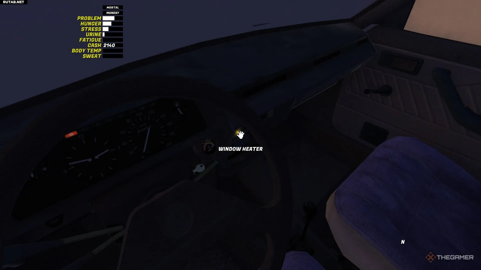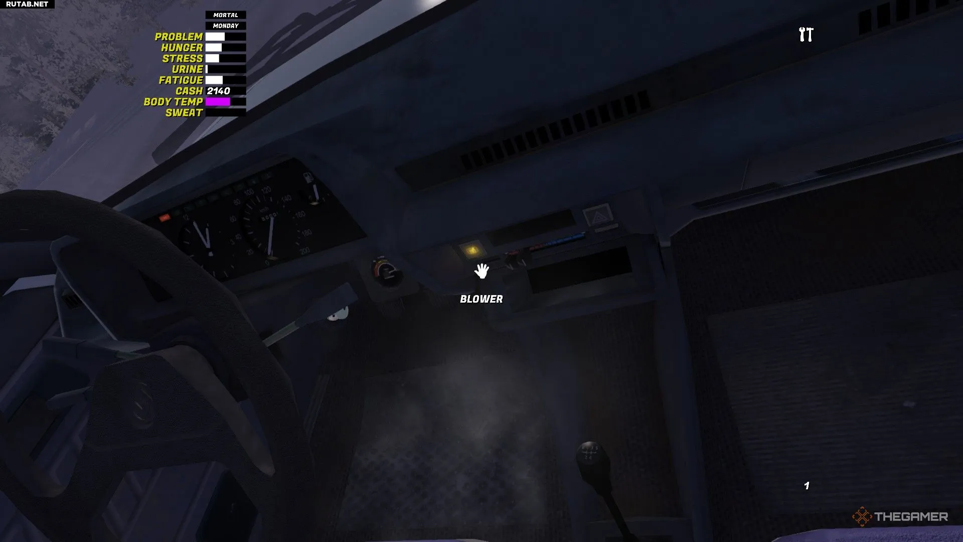 Вы почти у цели. Теперь вам нужно опустить ручной тормоз, включить заднюю передачу (нажмите B), а затем вручную переключать передачи (B — вниз, G — вверх), чтобы ускоряться. Следите за температурой двигателя (индикатор слева) и уровнем топлива в баке (справа; в начале игры обычно половина бака), и вы свободны путешествовать в свой первый день.