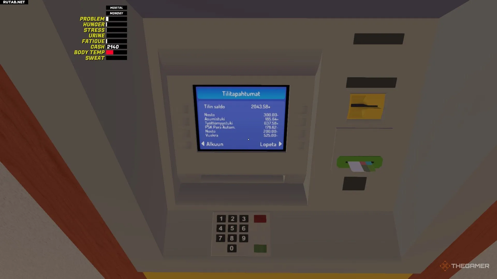 Вы увидите индикатор денег в верхнем левом углу экрана, но это деньги, которые у вас с собой. У вас также есть банковский счёт (и кредитная карта), даже если игра вам об этом никогда не говорит. Вы начинаете с 2000 MK на своём счету, так что в общей сложности у вас чуть больше 4000 MK.