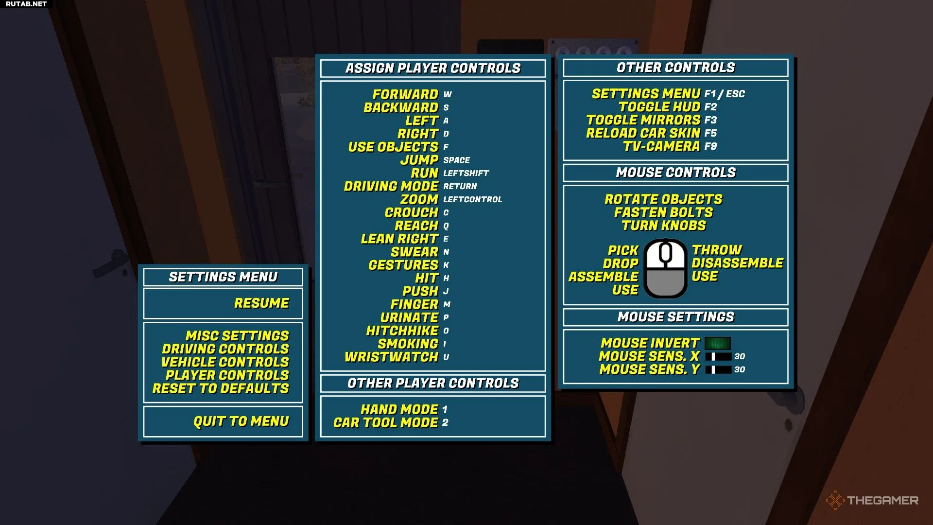 Нажмите F1 и проверьте различные настройки для персонажа и управления транспортом. Например, вы обнаружите действие «Дотянуться» (Q), которое позволяет вам приблизиться к объектам. Поскольку в игре странный датчик обнаружения предметов, вы будете часто использовать эту клавишу, чтобы подбирать вещи или осматривать окружение.
