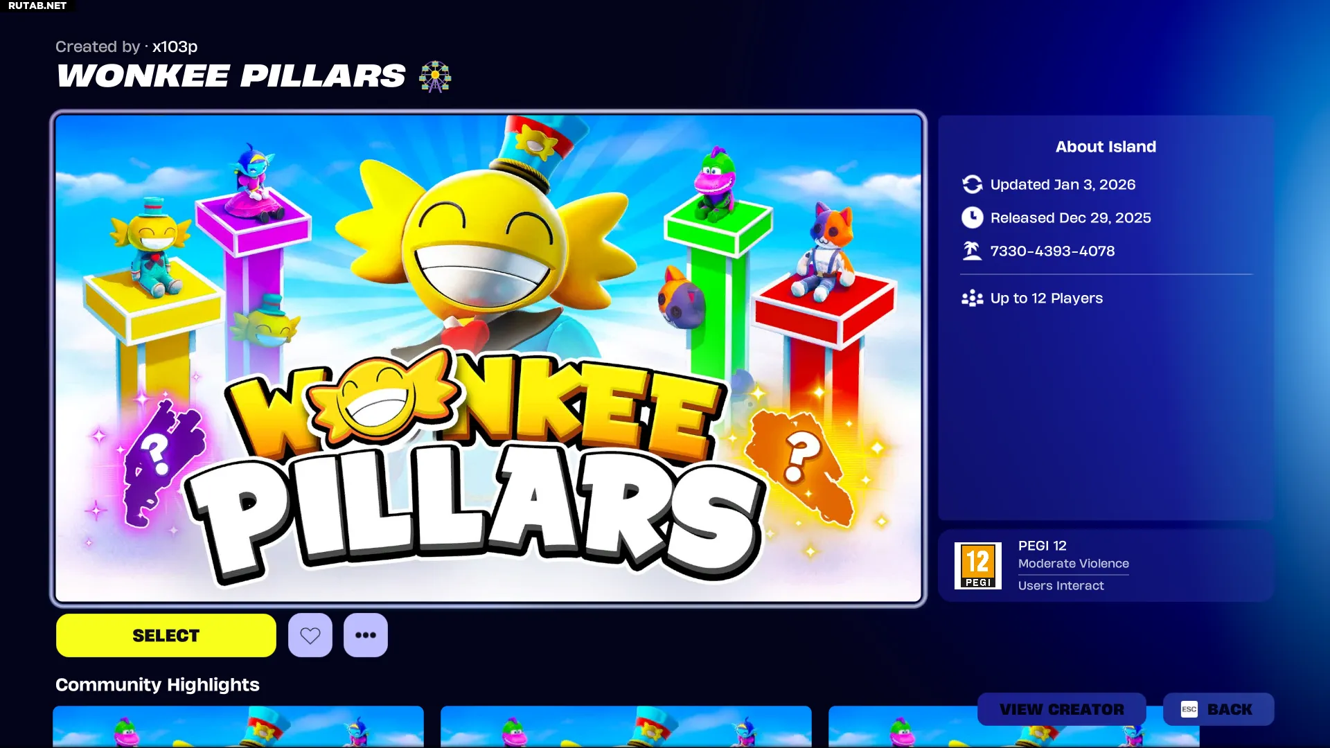 Найти карту Wonkee Pillars можно через вкладку «Поиск» (Discovery), введя код острова: 7330-4393-4078. Карта поддерживает до 12 игроков, поэтому можно играть с друзьями или в случайном отряде.