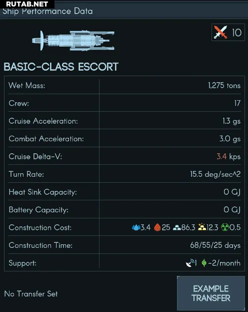 - Крейсерский запас характеристической скорости (ΔV) — показатель количества топлива. Определяет, как далеко корабль может улететь на стратегической карте и насколько он маневренен в бою.