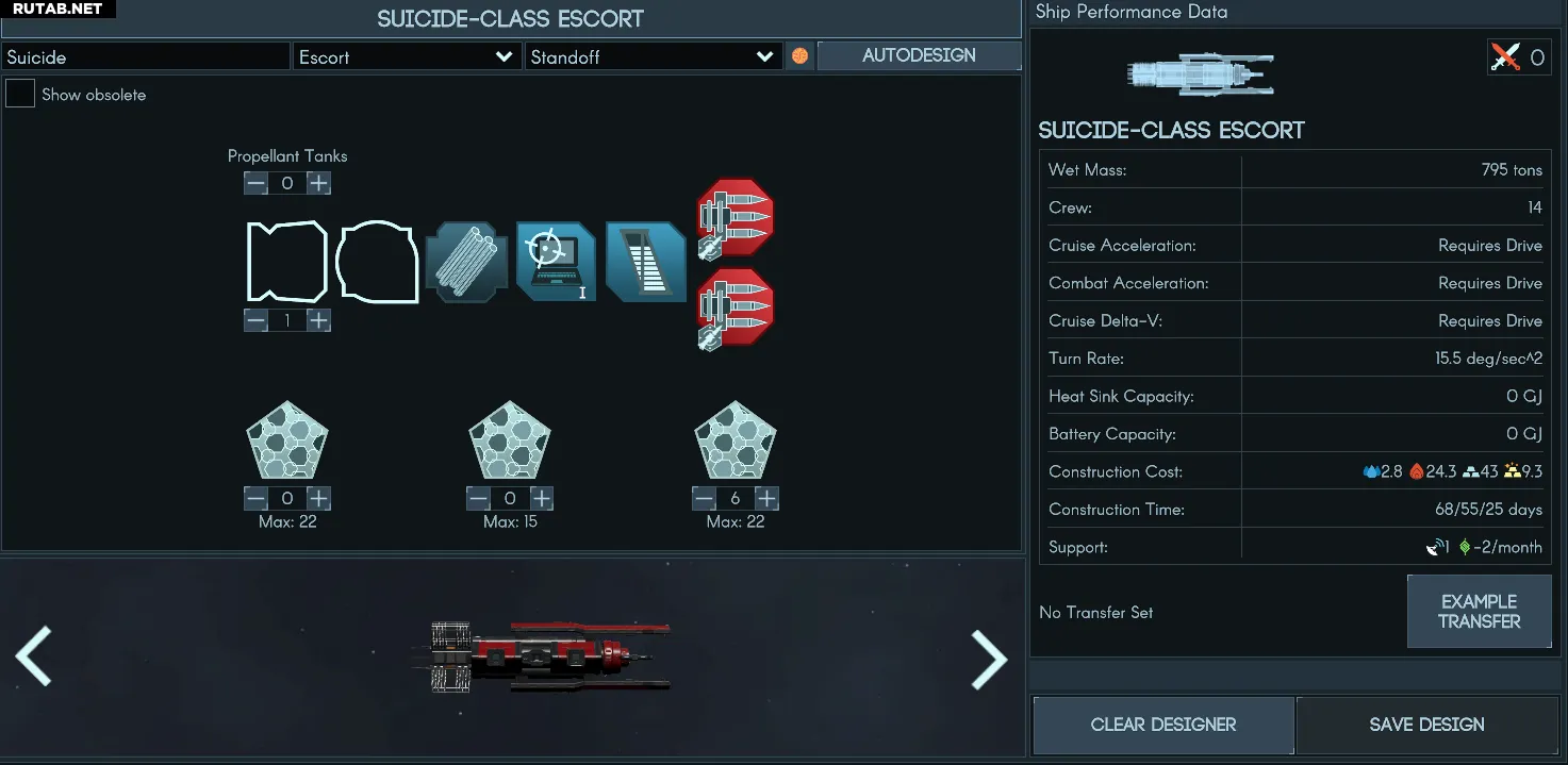 - Топливо / Материалы на бак — указывает, какой тип топлива использует корабль. От этого зависит, какие корабли могут делиться топливом друг с другом.