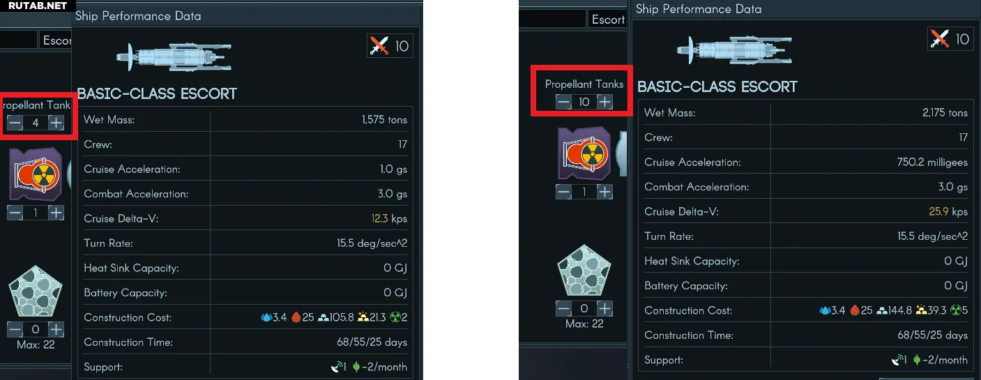 Ниже вы можете увидеть разницу между кораблём с 4 баками и кораблём с 10 баками при прочих равных компонентах конструкции.