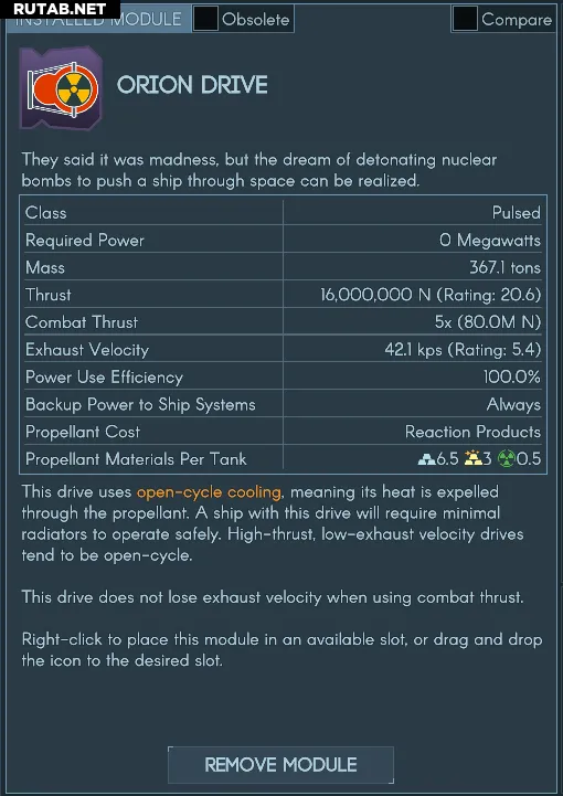 - Тяга — определяет, насколько быстро двигатель может разогнать корабль. Рейтинг использует логарифмическую шкалу по основанию 2, поэтому двигатель с рейтингом +1 в два раза эффективнее. Это можно сравнить с показателем разгона автомобиля от 0 до 100 км/ч.