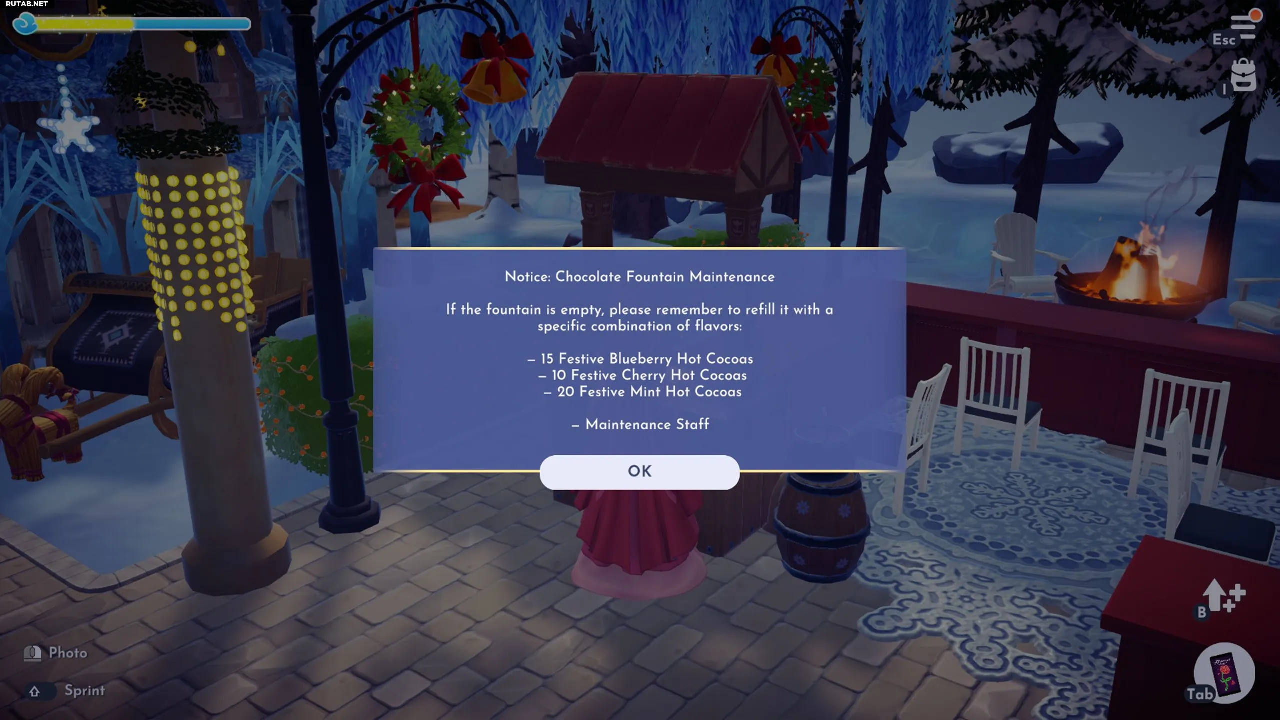 Чтобы починить шоколадный фонтан, нужно дать ему 10 Праздничного вишнёвого горячего какао, 15 Праздничного черничного горячего какао и 20 Праздничного мятного горячего какао. Это те же самые напитки, которые вы предлагаете кролику. Подробности можно узнать, прочитав жёлтую книгу в кафе. Вот где найти ингредиенты: