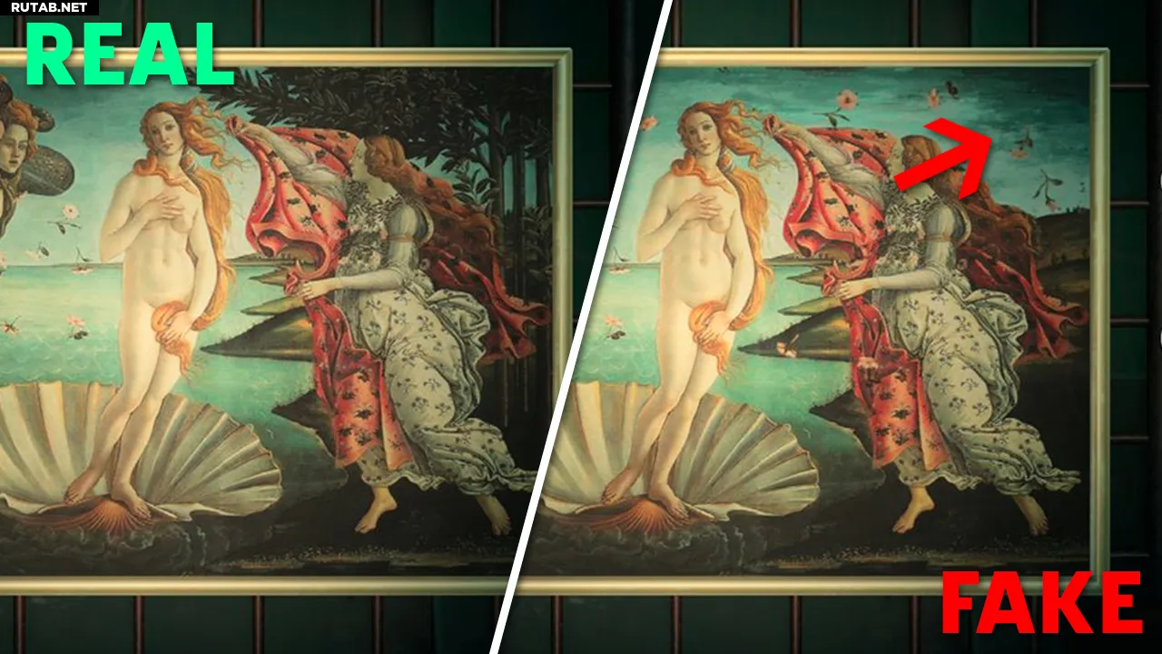 | Трогательная картина | «Рождение Венеры» Сандро Боттичелли | На правой стороне настоящей картины изображены высокие деревья. На подделке их нет. |