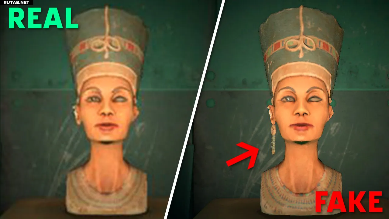 | Мистическая статуя | «Бюст Нефертити» работы Тутмоса | У поддельной статуи есть серьга-подвеска. |