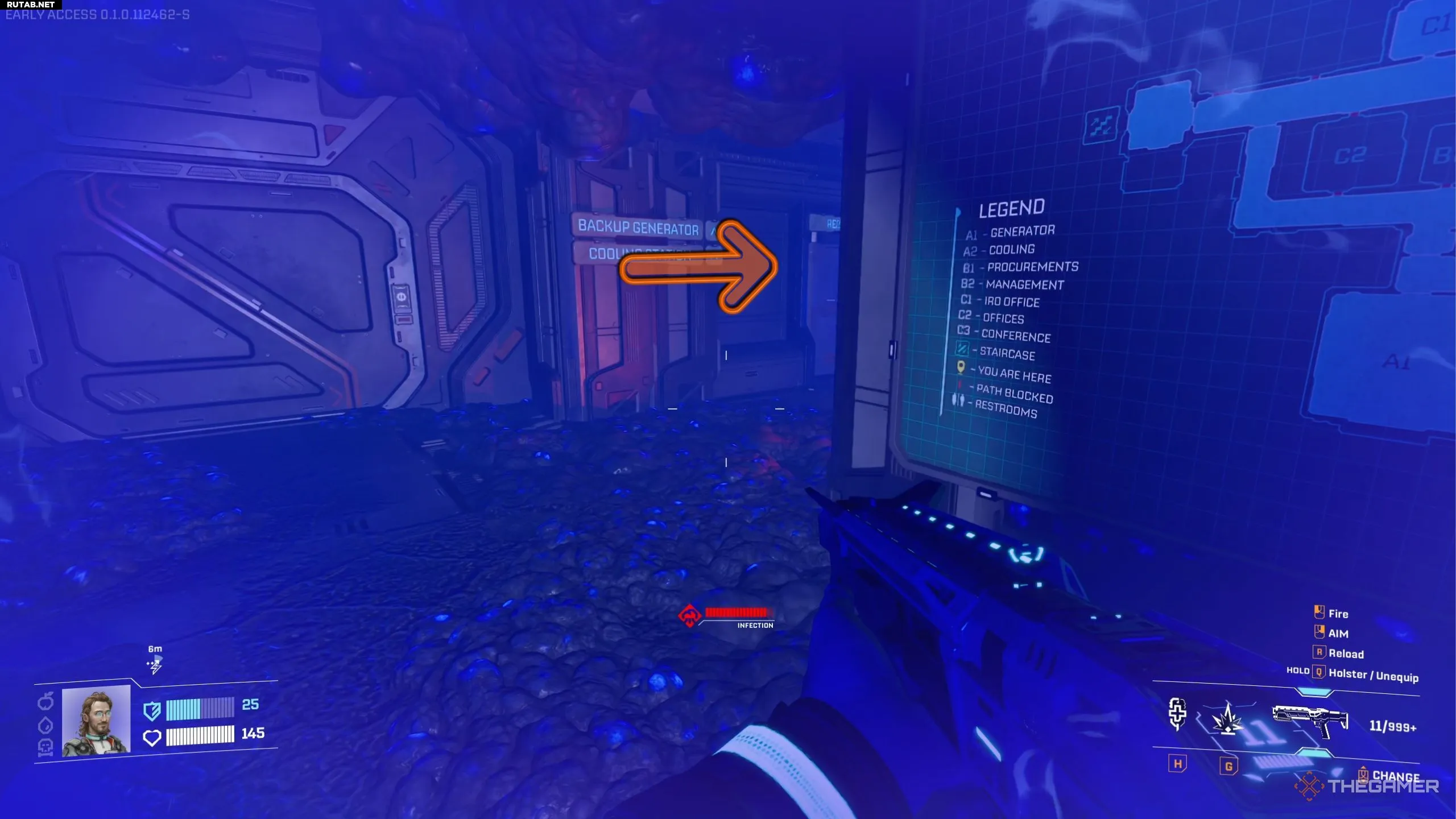 Это описание маршрута для случая, когда вы входите на этаж технических станций с северной лестницы — той самой, которую вы изначально использовали для входа на этаж главного двигателя. Пройдя немного вперёд, вы увидите небольшую щель в двери справа. Через неё можно выстрелить в опухоль инфекции и продолжить движение.